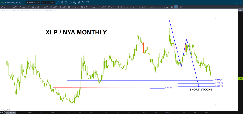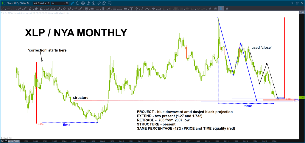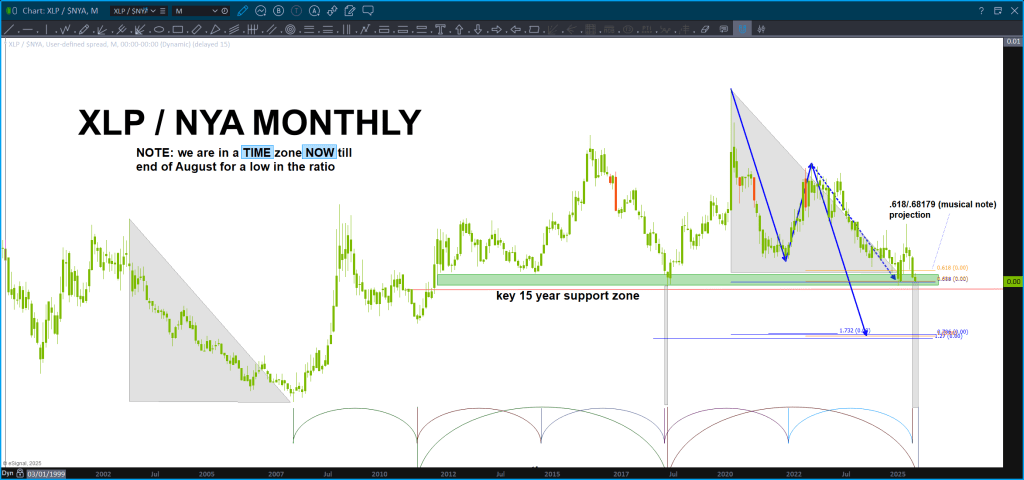 Last night we showed you a bunch of charts. The most important, at least for me, was the chart of the XLP/NYA ratio. Been blogging about this target zone for a WHILE. Was getting really sick of it to be honest :), and, remember, the PROJECTION lies right on the .786 so ‘ technically’ it hasn’t been hit but, I’m making the call based on the PRICE and TIME confluence (price being percentage same).