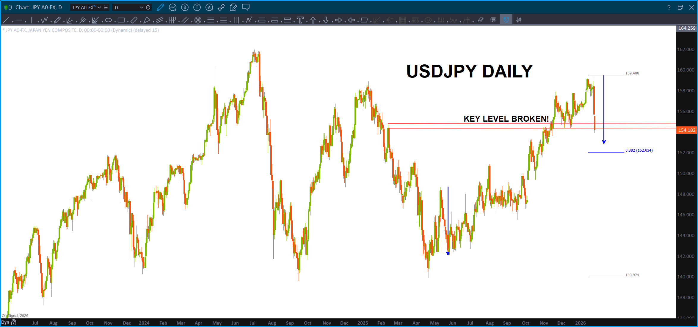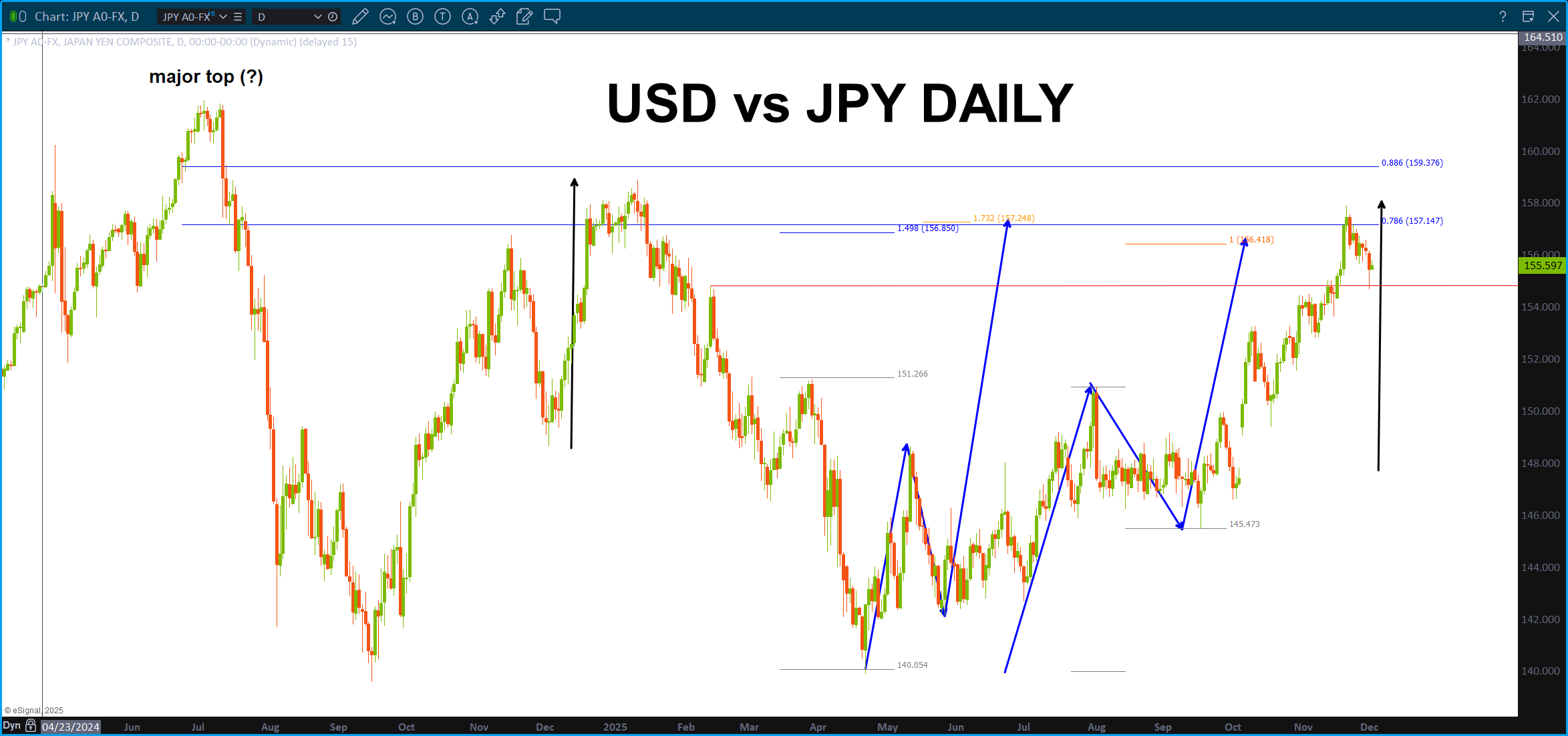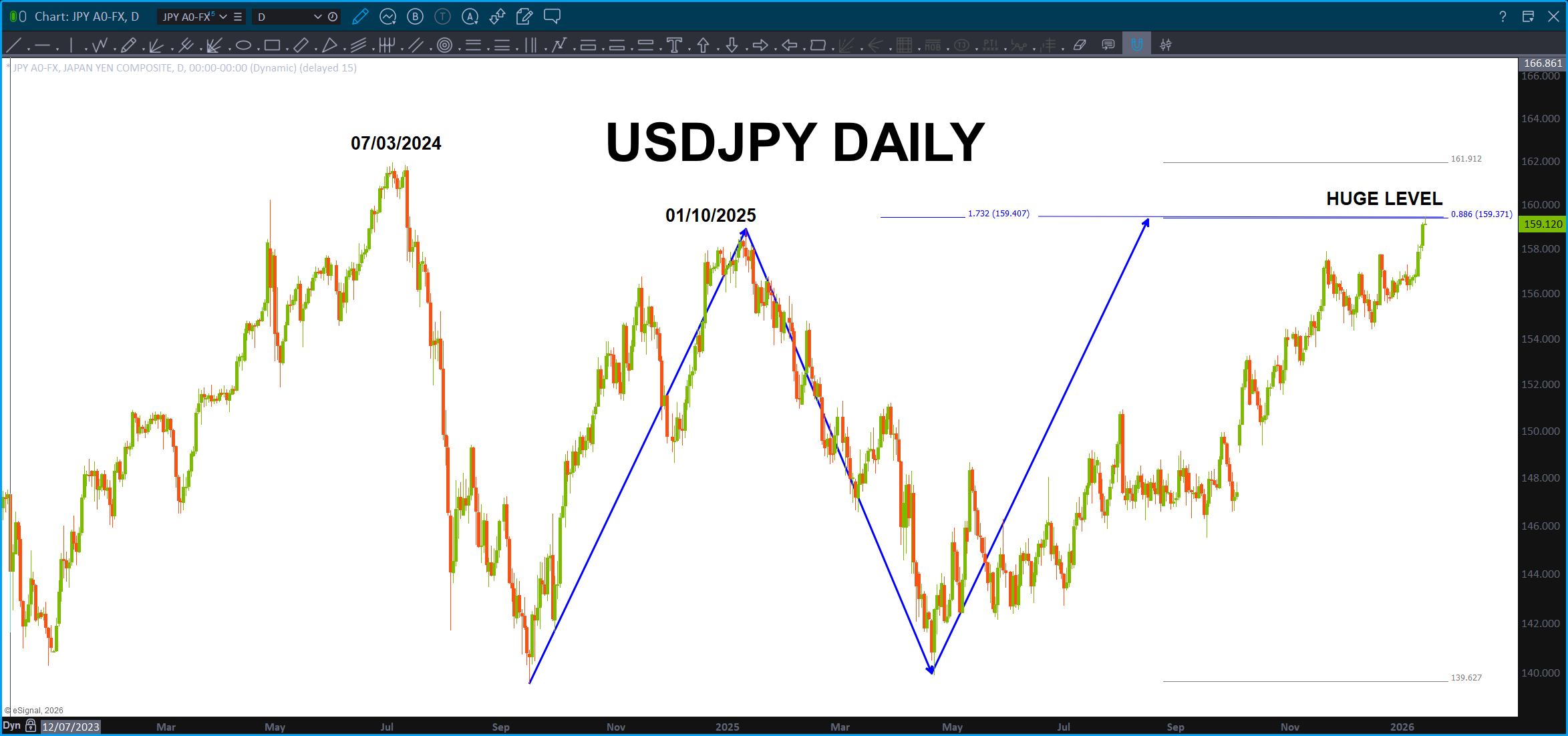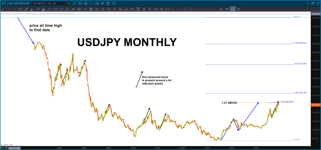 Here’s the most recent price action on a Monthly … if we take the most recent swing high at 139-140 out to the upside then do believe we have a VERY strong target in the 155 area and the 160-162. YES I WILL BE WATCHING 161.8 for the resistance. 🙂