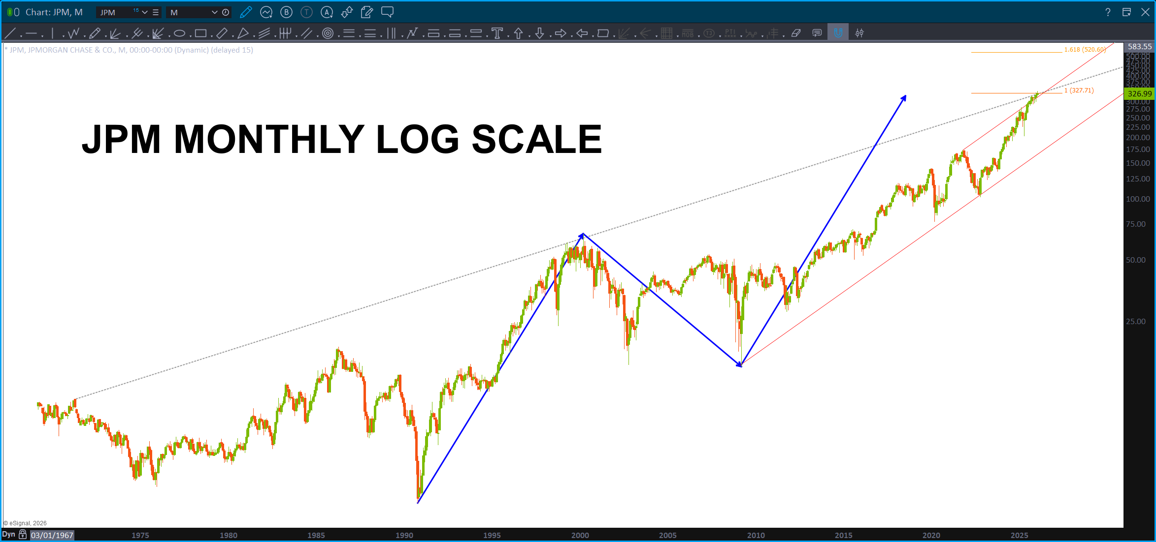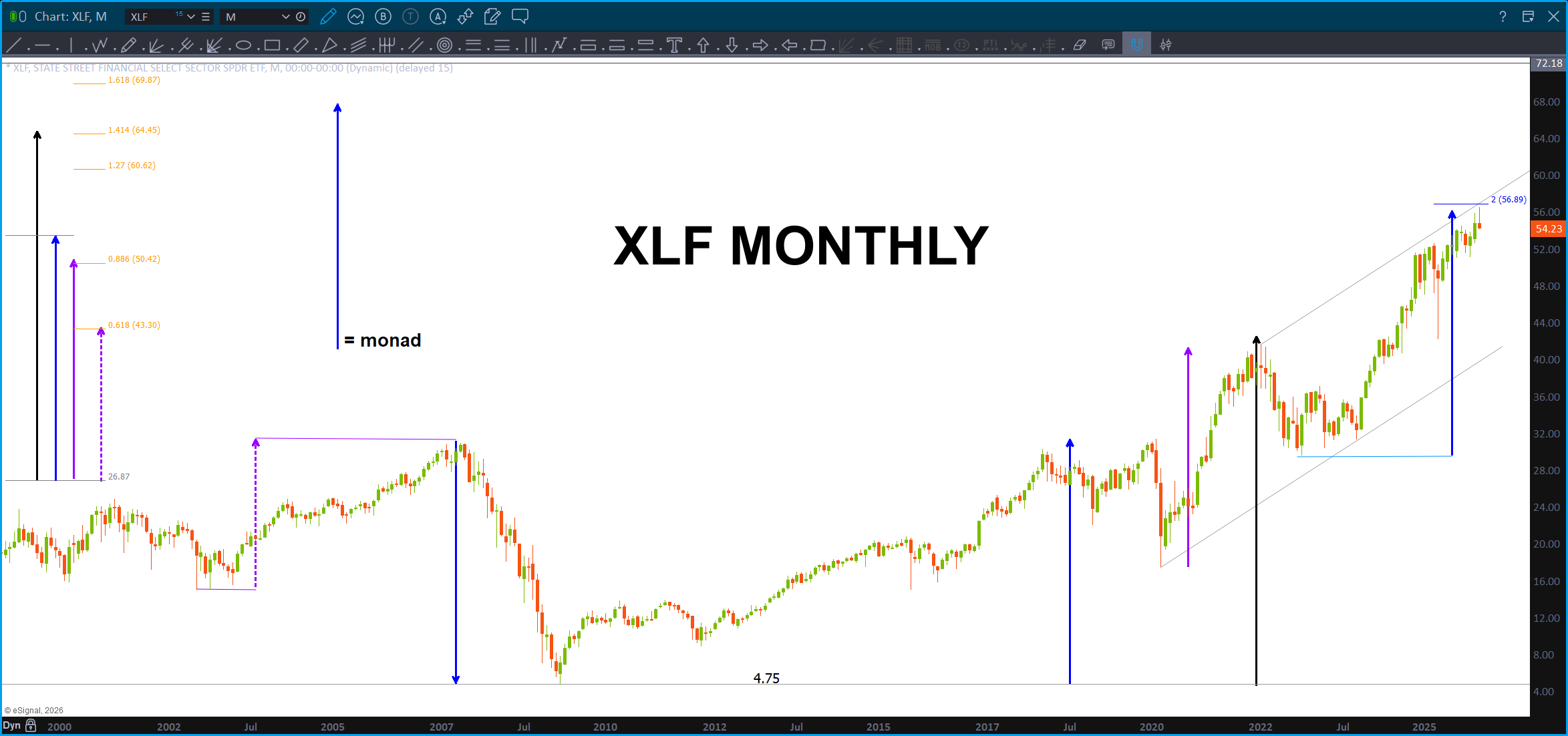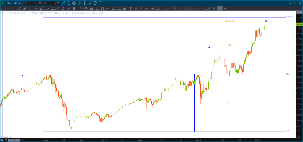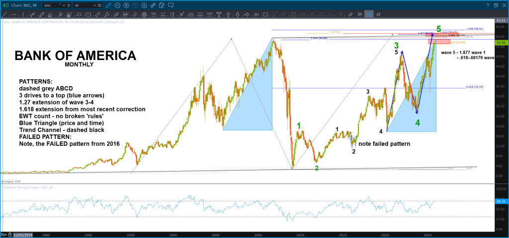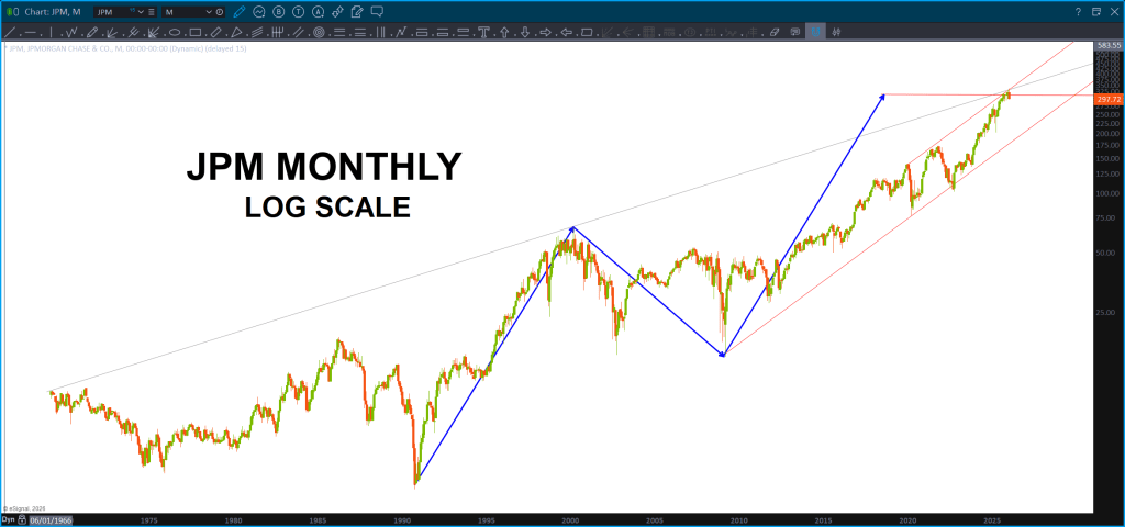 Note, this is a Monthly, since IPO, chart of JPM. Also note, it’s LOG scale so we are dealing w/ percentages .. you can always tell by looking at the right (or left) price margin. When it’s normal spacing you are using normal scaling but when you see big jumps like above – that’s LOG scaling. Well, guess what? ABCD on LOG scale works also! So … couple converging trendlines w/ a projection pattern complete. Note, remember the above about the KBW/XLF.