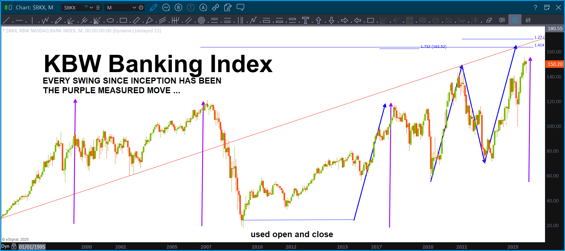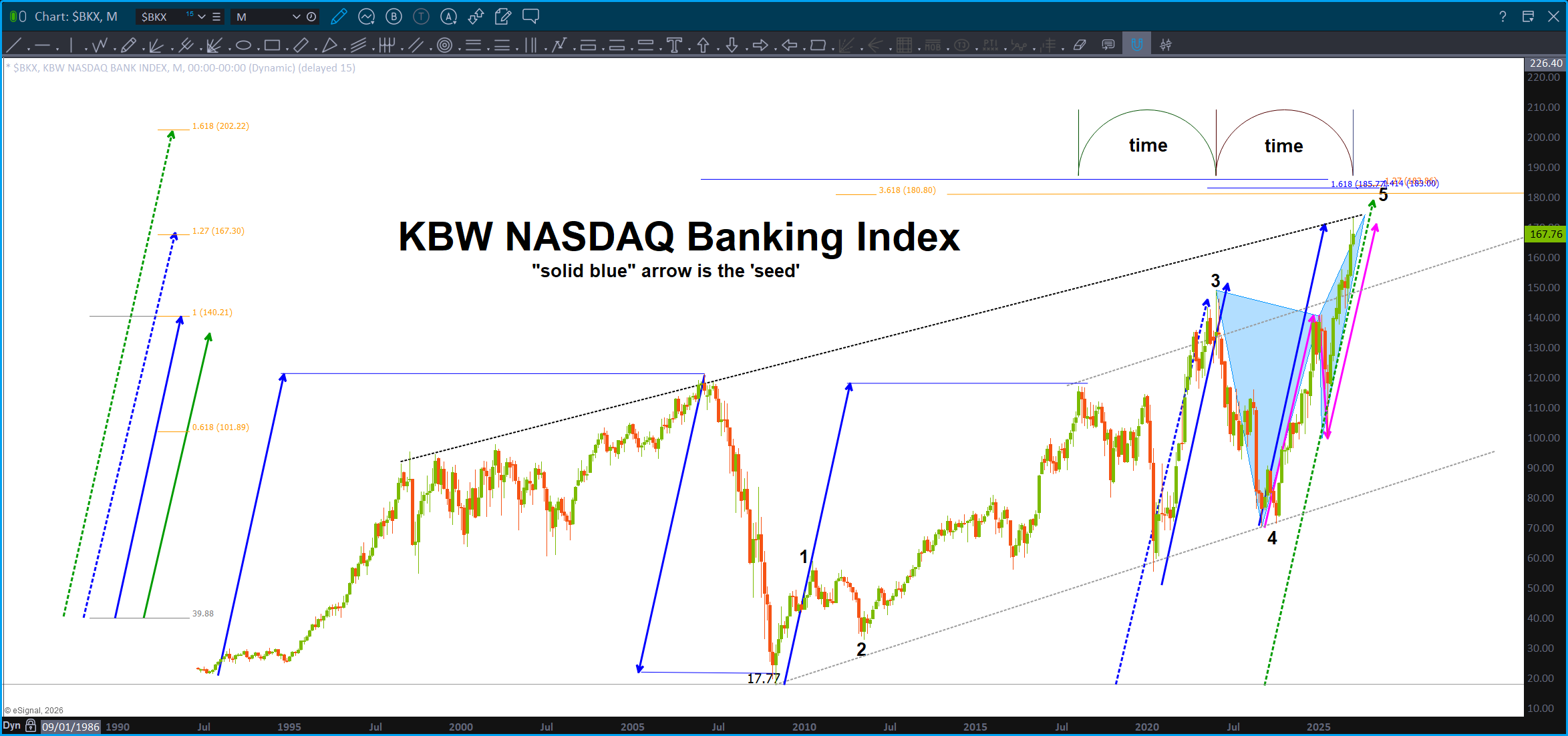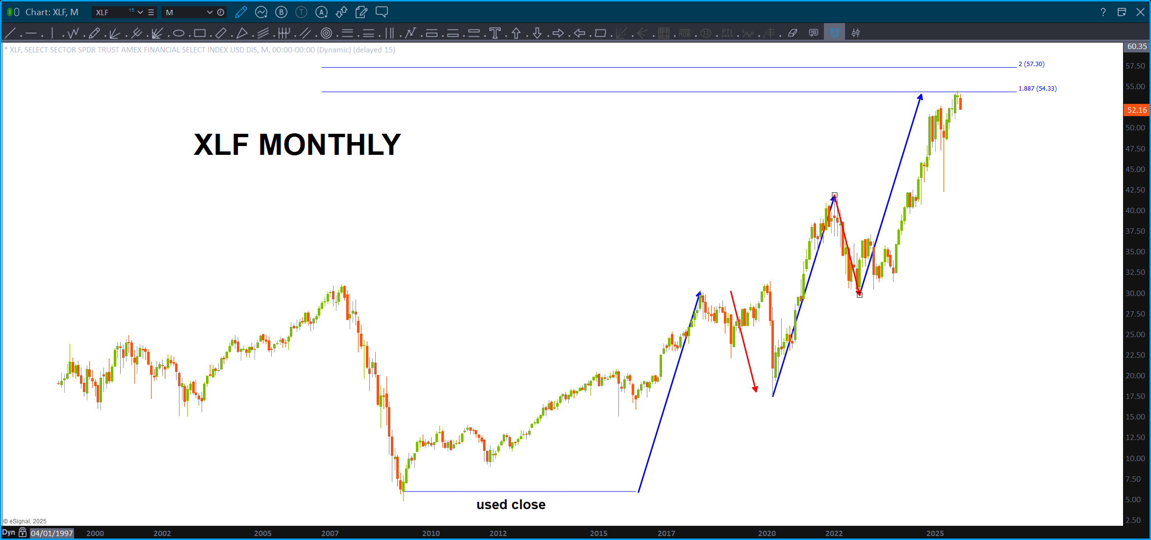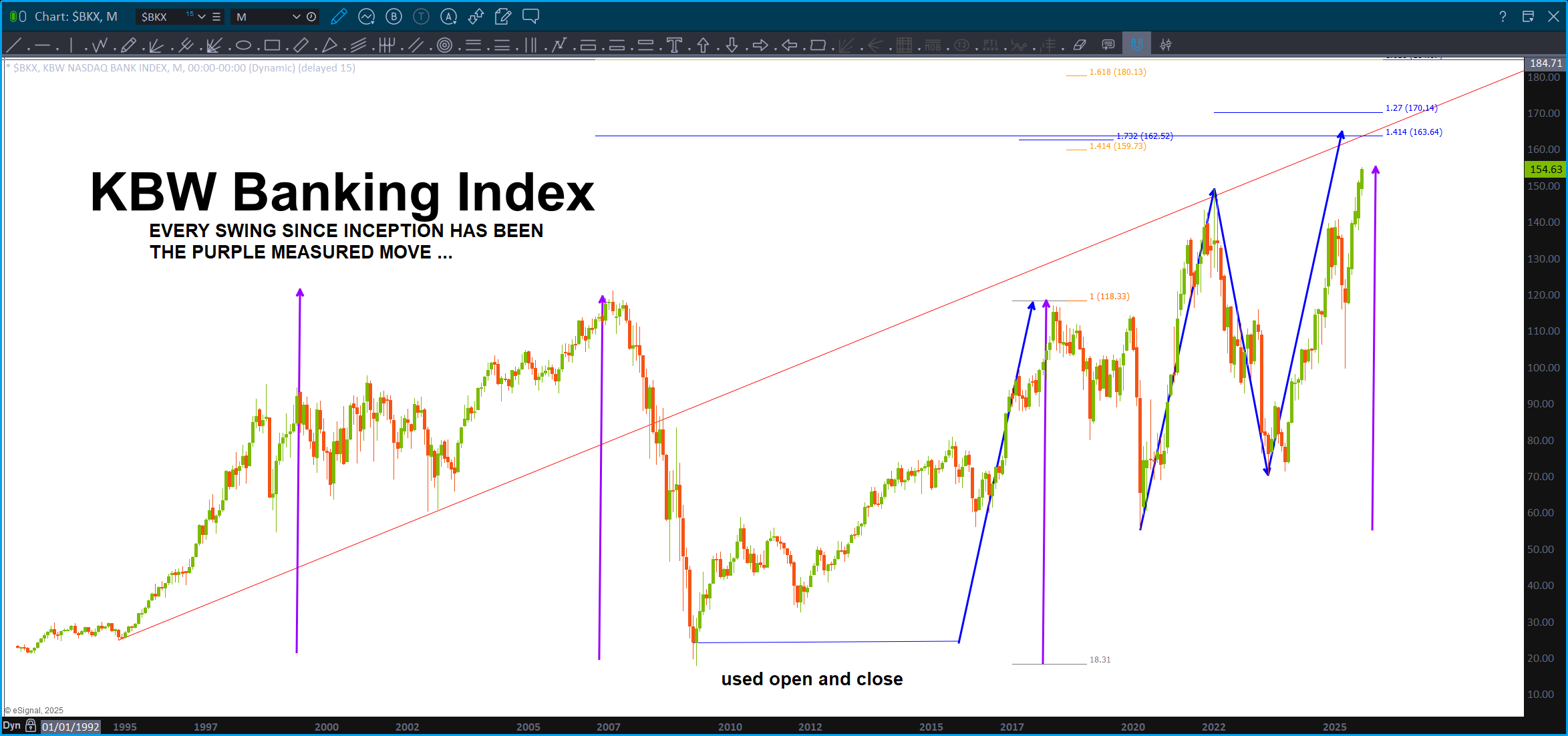 Note, this is a Monthly, since IPO, chart of JPM. Also note, it’s LOG scale so we are dealing w/ percentages .. you can always tell by looking at the right (or left) price margin. When it’s normal spacing you are using normal scaling but when you see big jumps like above – that’s LOG scaling. Well, guess what? ABCD on LOG scale works also! So … couple converging trendlines w/ a projection pattern complete. Note, remember the above about the KBW/XLF.