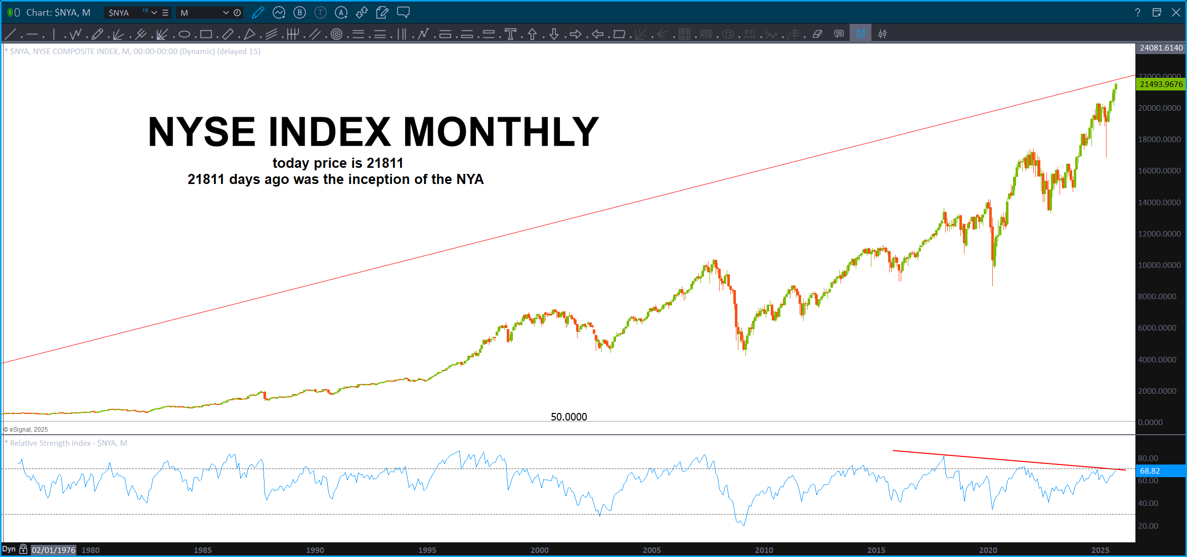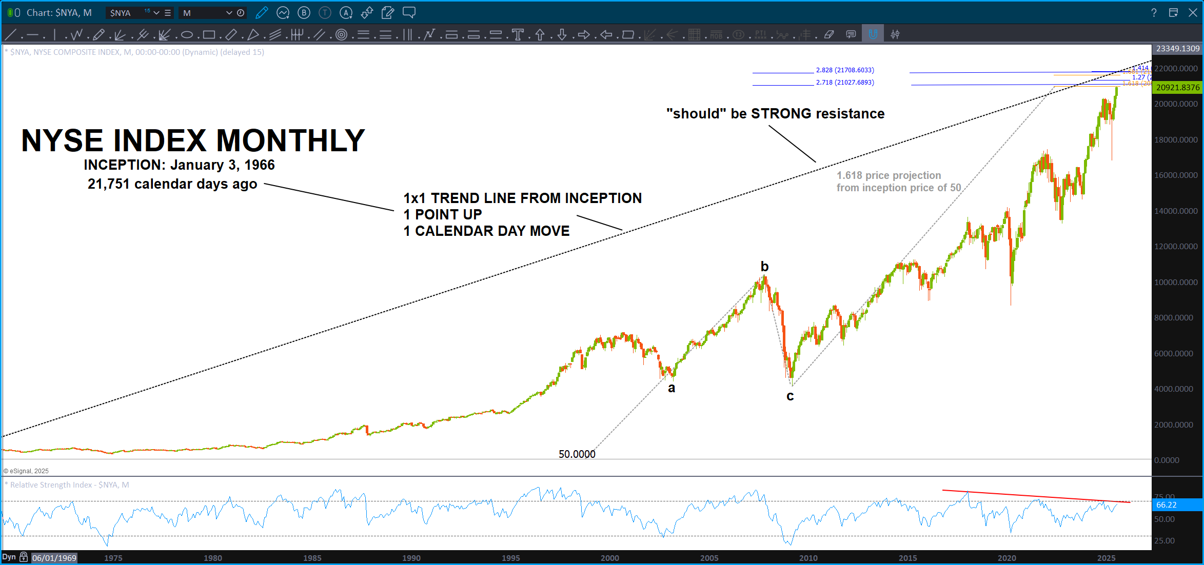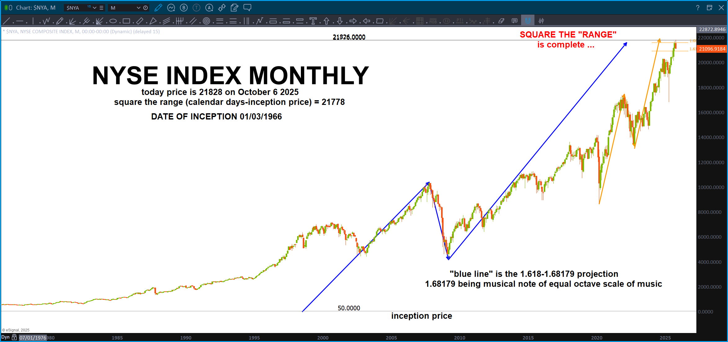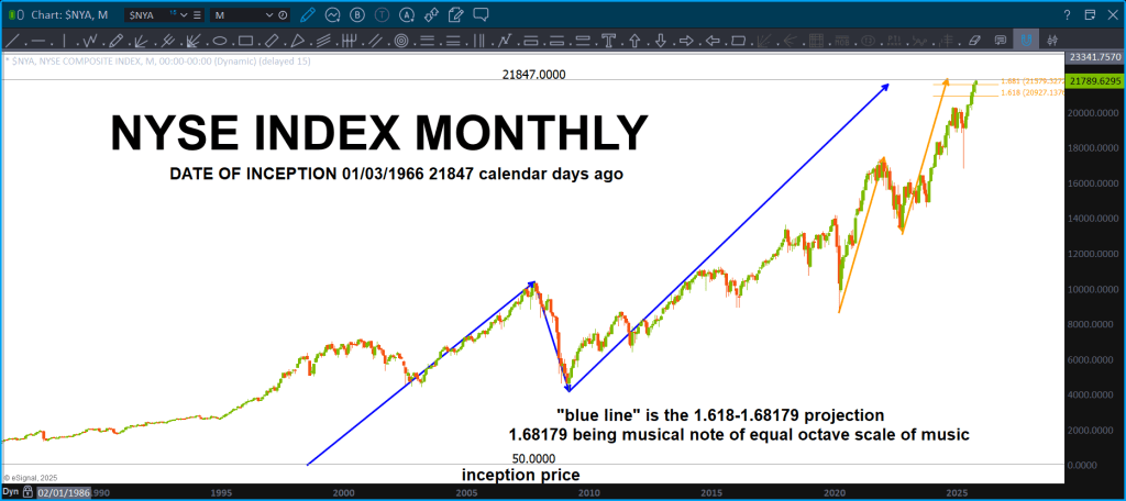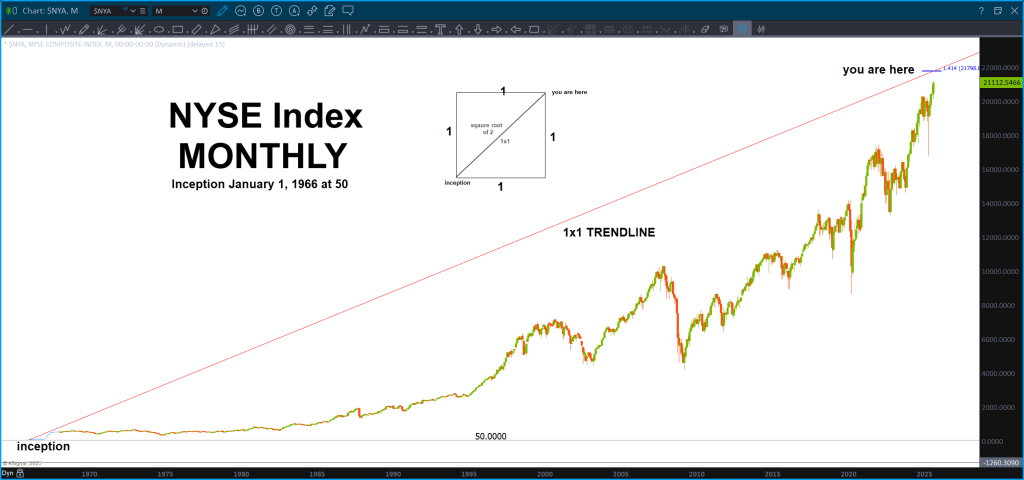 Since the NYSE Composite Index launched in 1966, its trajectory has traced not only the rise and fall of markets, but the structural shifts of a world in transformation. In the decades since, we have witnessed the Vietnam War, the collapse of Bretton Woods, the oil shocks of the 1970s, the Reagan-era deregulation wave, Black Monday, the fall of the Soviet Union, the birth of the euro, 9/11, the 2008 financial crisis, and the COVID-19 pandemic. Today, we stand amidst renewed geopolitical fragmentation, rising multipolar tensions, conflicts in Ukraine and the Middle East, and a visibly fractured American political landscape. These are not isolated events—they are inflection points, waves folding through time. The market, in its silent geometry, now approaches a place it has never touched before: the harmonic return of time meeting value.