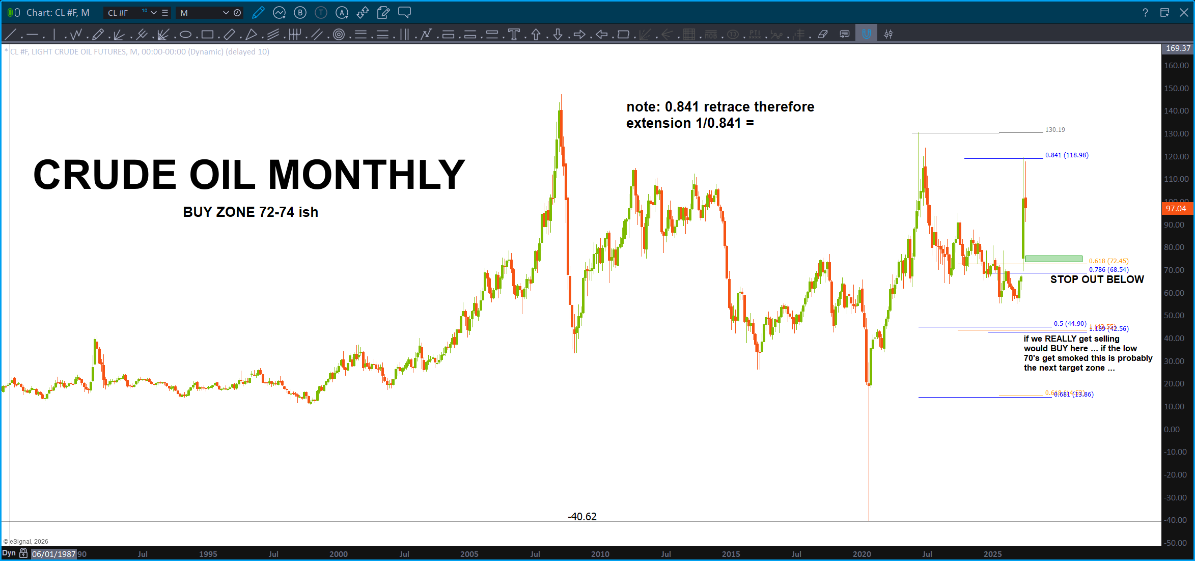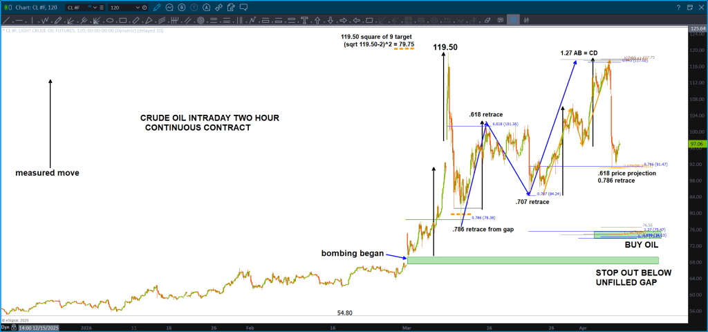 So, after letting the emotional vibration play out in both fear and euphoria …they have left us THE seed to now manage risk in this insane environment. You see what happened there …? While you go thru the same emotions as those actually trying to trade these insanely volatile moods, you contribute to the footprint that is being left on the charts but you have the discipline to wait. So, you wait for the emotions – for this particularly security of Crude Oil Continuous Futures – to form the measured moves which are now your graphical representation of – get this – the vibration associated w/ crude oil and this current conflict. Yup …