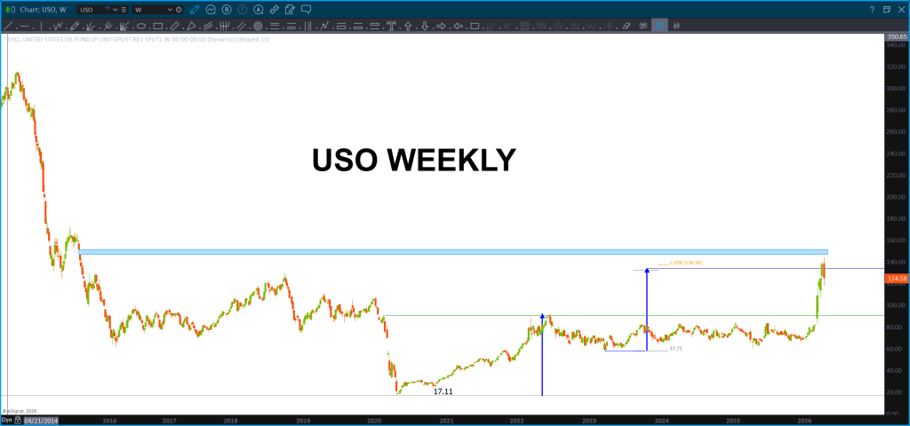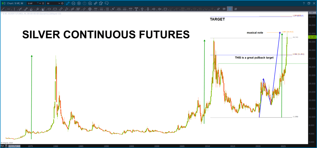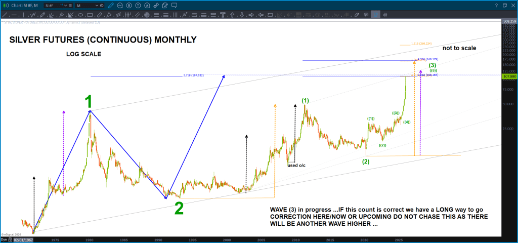 This charts goes back to 1972 folks and, IF my count is correct (obviously the big if) THEN we are going to have a pullback soon, but folks, you want to BUY THIS PULLBACK and I will be hawking it to BUY also as we haven’t even finished wave 3 yet. SILVER IS A BUY. Woah …. IYKYK. The chess match for precious metals has just got a lot more interesting, hasn’t … 200 dollar silver? Again, WOAH.