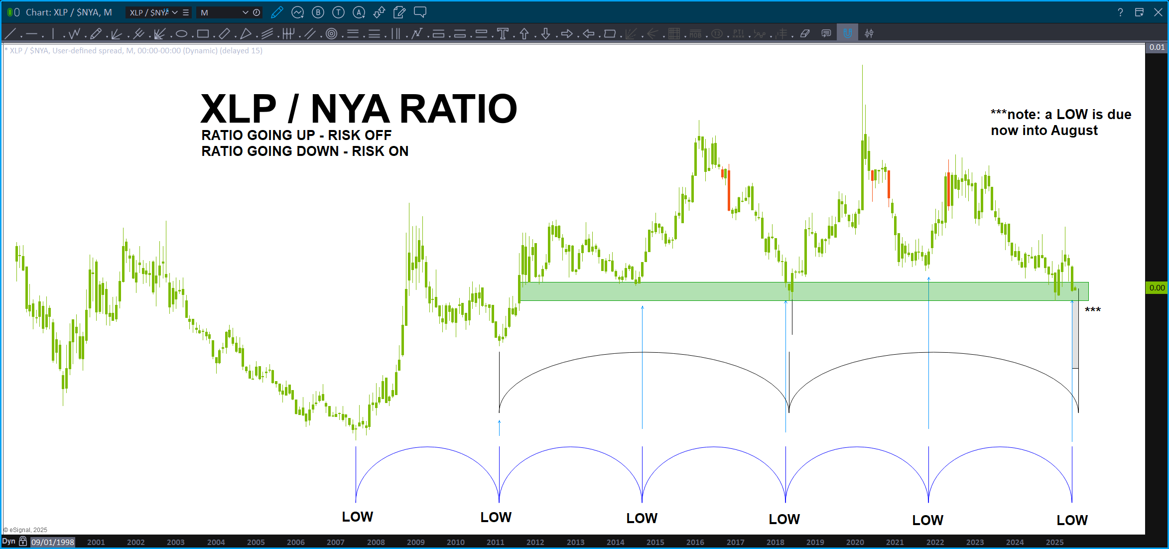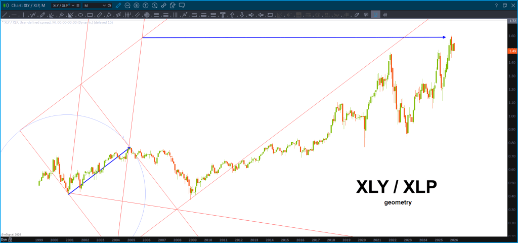 The reason I’m cautious is because of TIME. Note the dual cycle convergence happening now. Remember, this is a monthly chart so we are simply in a time zone where the ratio could bottom and start higher. Historically, that has proven to be resistance for equities.
