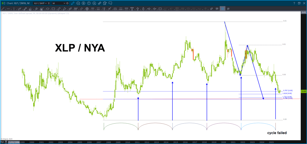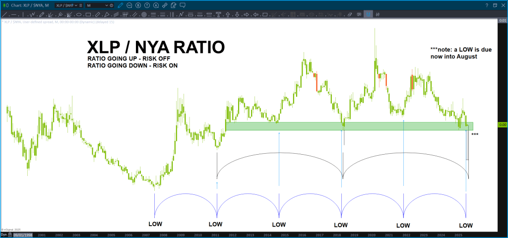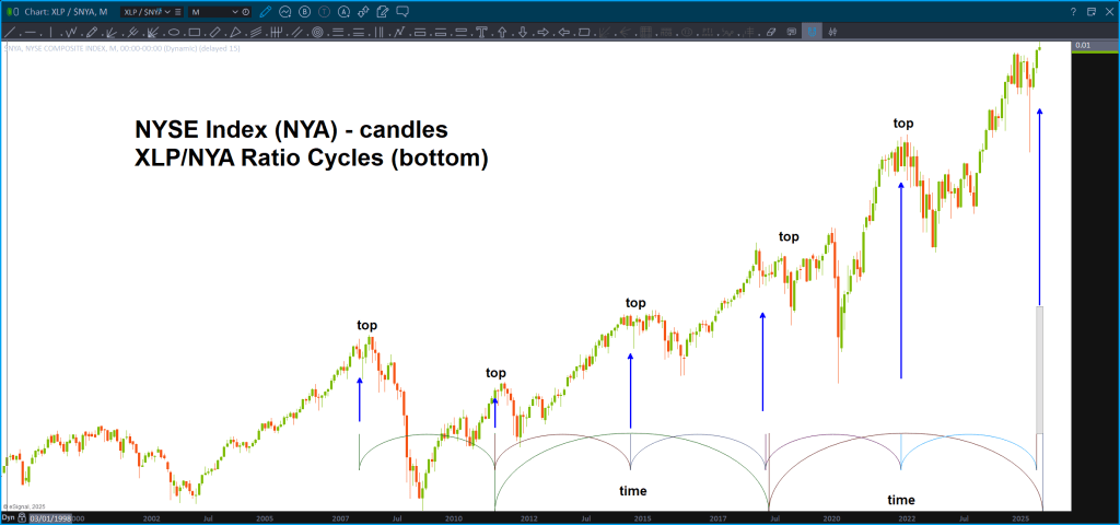 To show the importance of this ratio, I put the NYSE Index (NYA) on top of the XLP/NYA ‘static time’ cycles and you can see that – while not perfect (remember this is a monthly chart and we could have some slippage in the overlay) it’s not a stretch to say that when the ratio has bottomed, the market has topped or topped soon thereafter w/ a month or so.