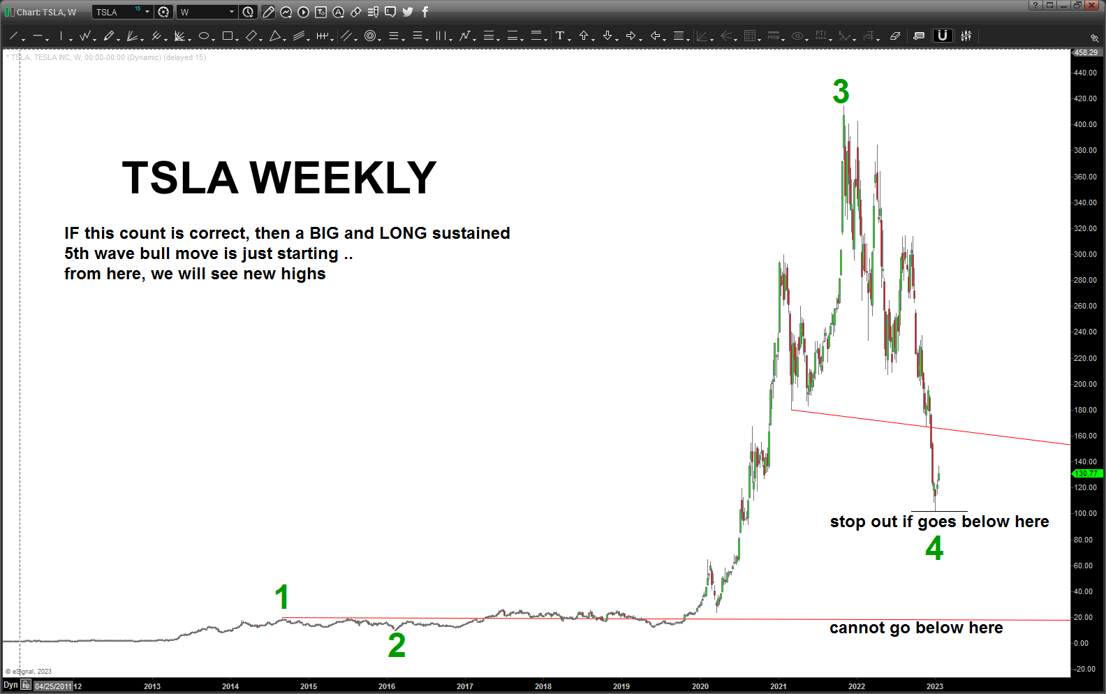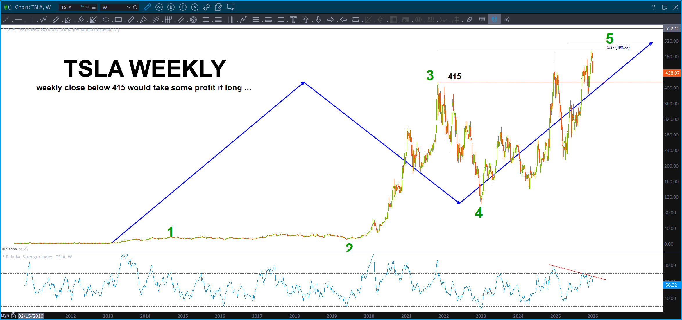 Thus far this count has worked … since we made a new high and smacked into the 1.27 extension and a clean 5 wave count can be seen, perhaps it’s time to take some profit on TSLA?