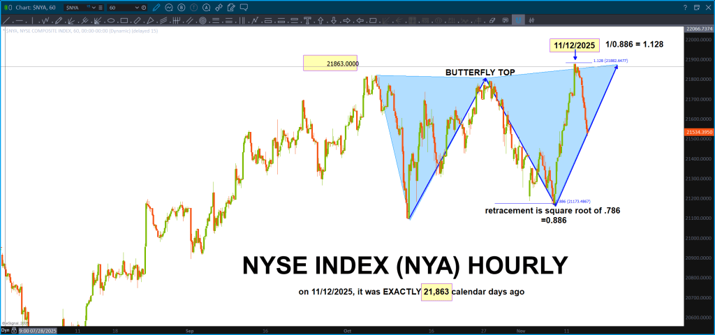 In studying the markets, which for me have been 25 years studying nothing but sacred geometry, musical theory, Pythagorean theory, kaballah, astrology, astronomy – basically consciousness – one might understand the sheer synchronicity of approaching resistance on the NYSE Index (NYA).