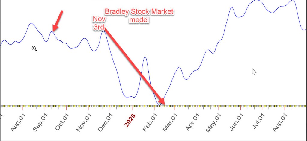 However, take note of the time cycles … it’s forecasting a ‘low’ in the ratio now – August.