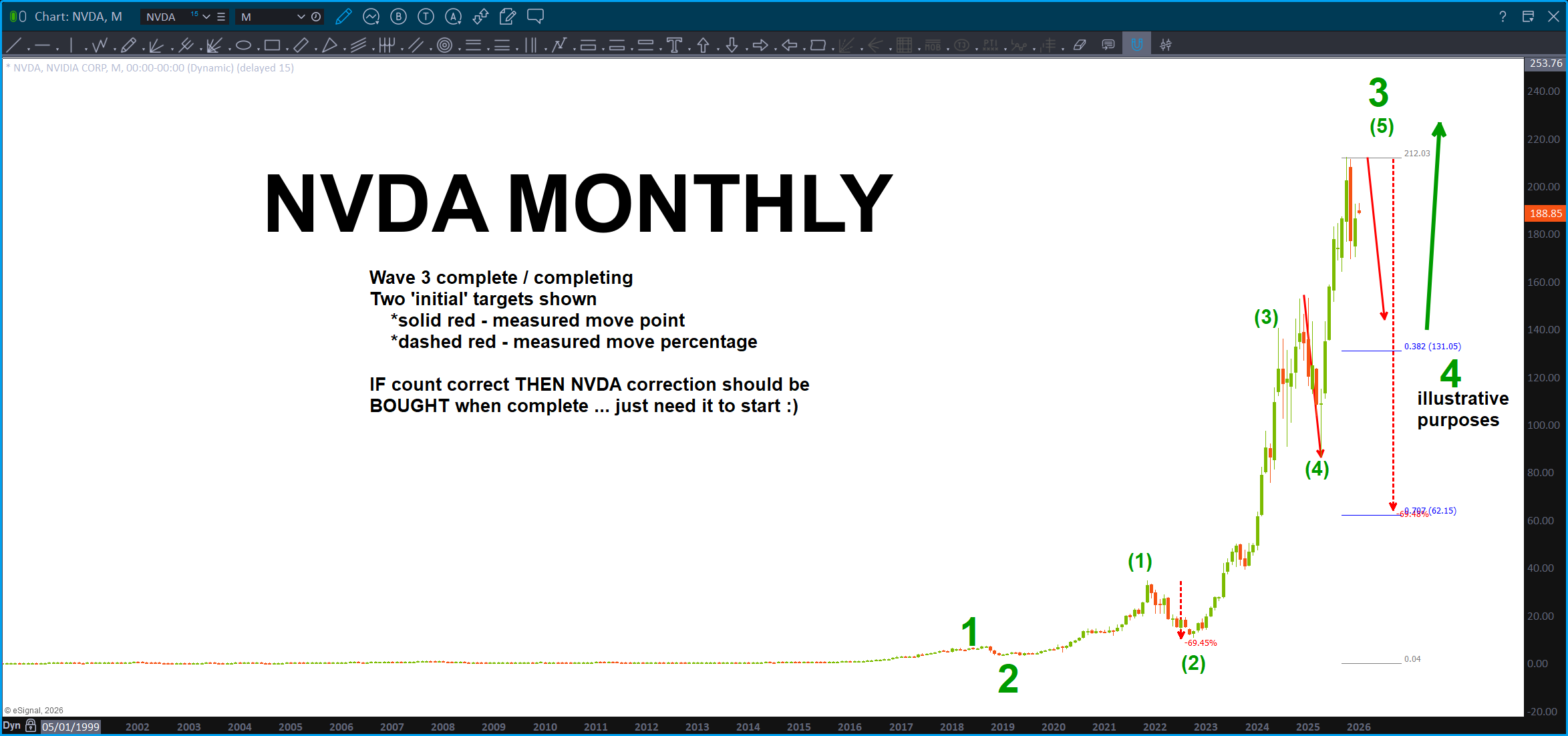 Take all that and here wave have AMZN. Hmmmmm … two projections with extensions make this THE key level for AMZN going any higher in the near term. Would really like to see it go up there and tag that level.