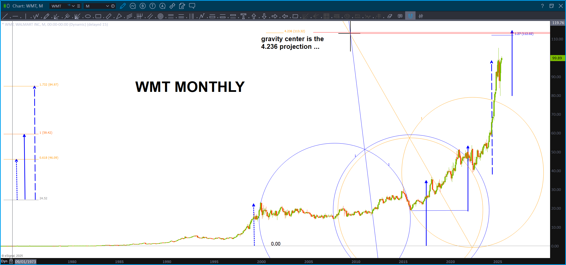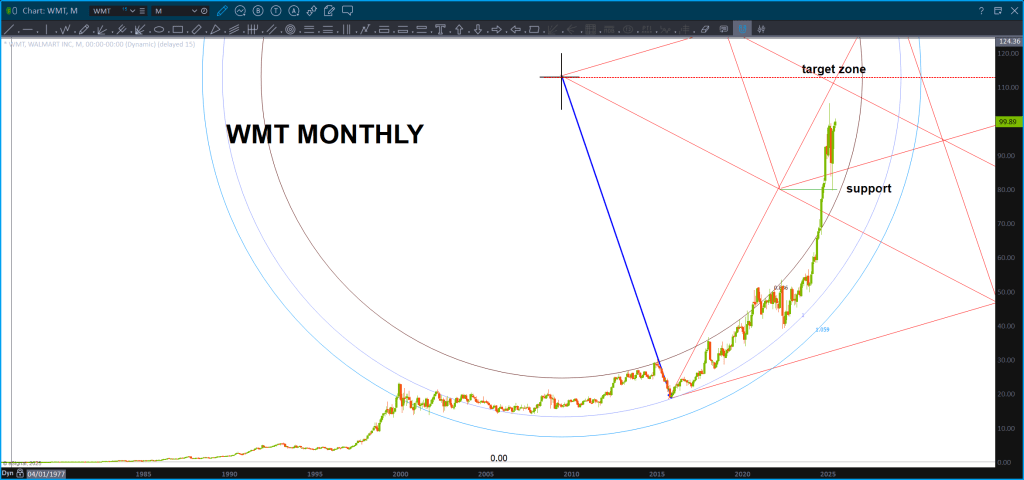 Using the technique of finding three lines on a plane to draw an arc I was very surprised that the 4.236 price projection (1.618^3) falls right on the gravity center. NO I did not do that on purpose … I’ve also done a 1.27 extension from the all time high and, last, take a look at the measured moves. Certainly looks like a strong target for WMT.