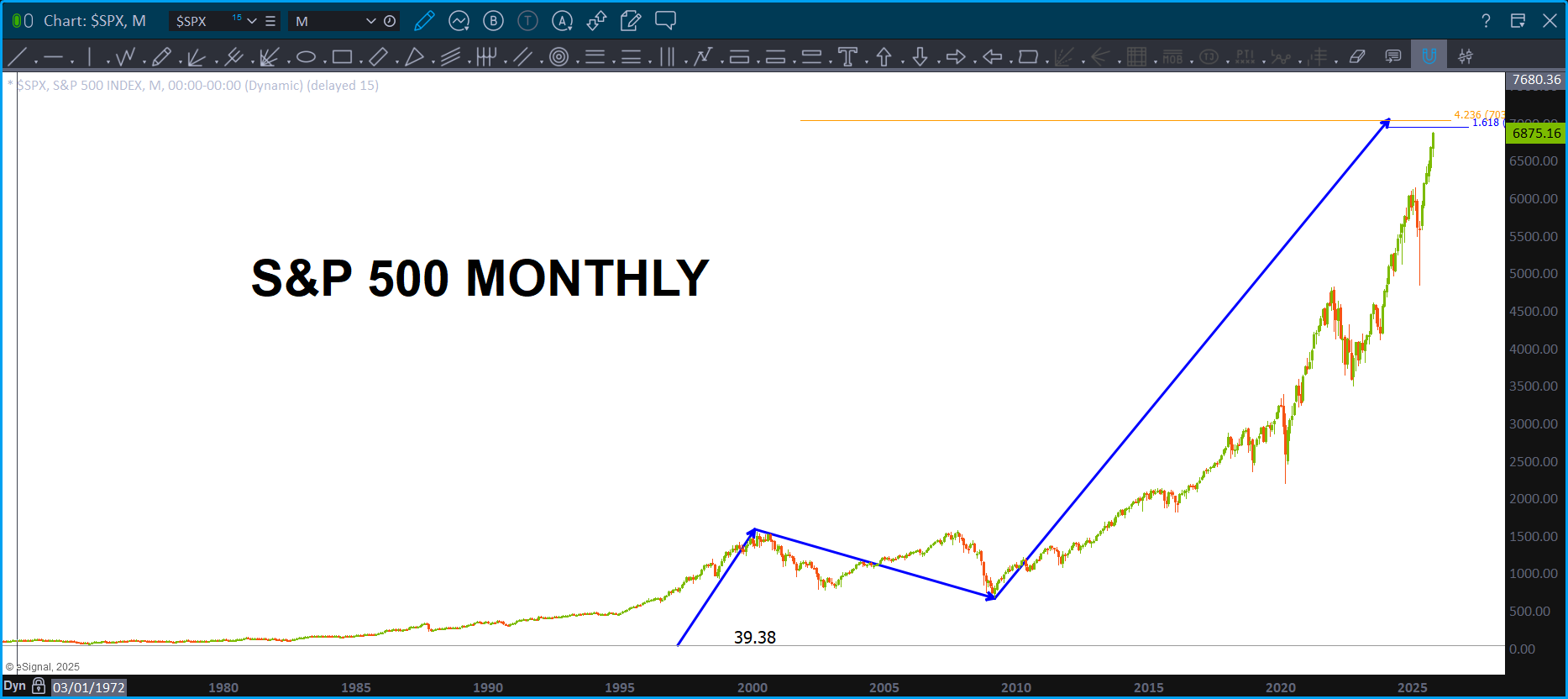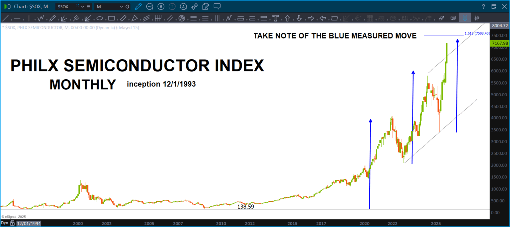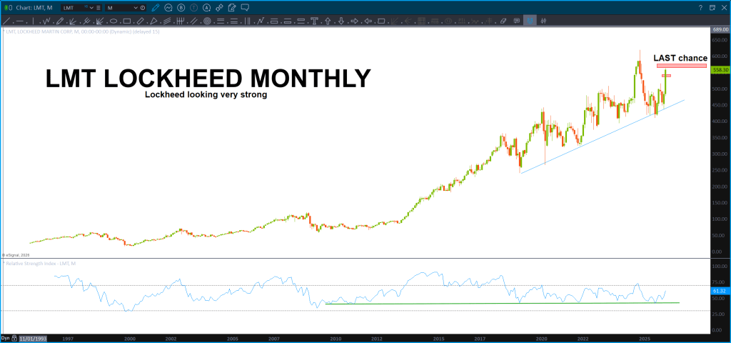 Here’s what the pattern failure looks like on a Monthly. There is some resistance approaching but, w/ the big Department of War (why Department of Peace?) asking for a HUGE increase in Defense Spending … yeah, I’m thinking we might pause here or something but this puppy looks STRONG.