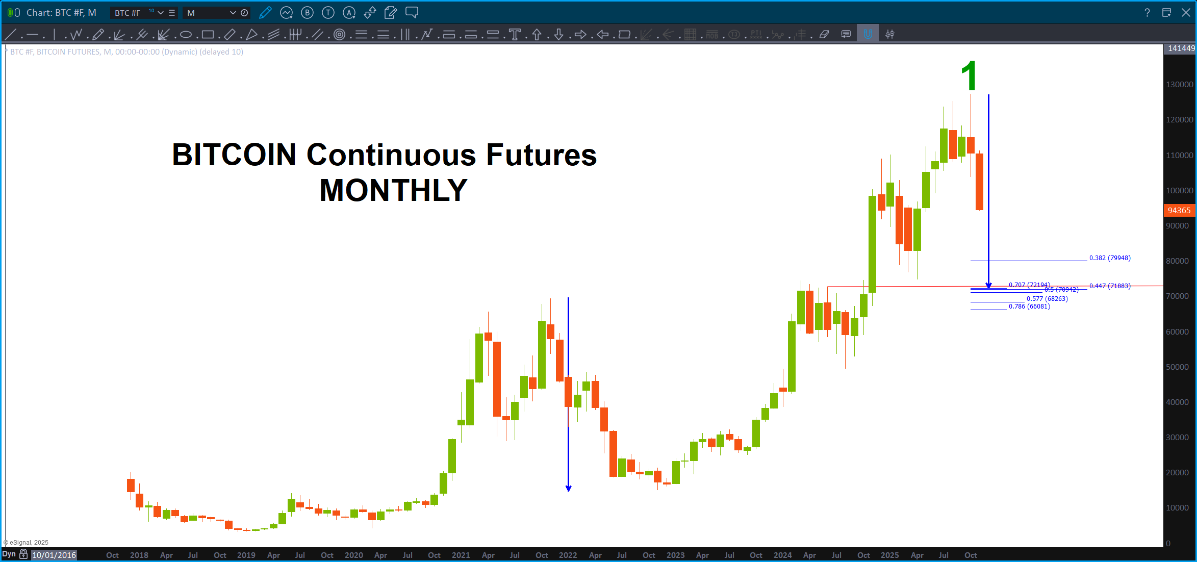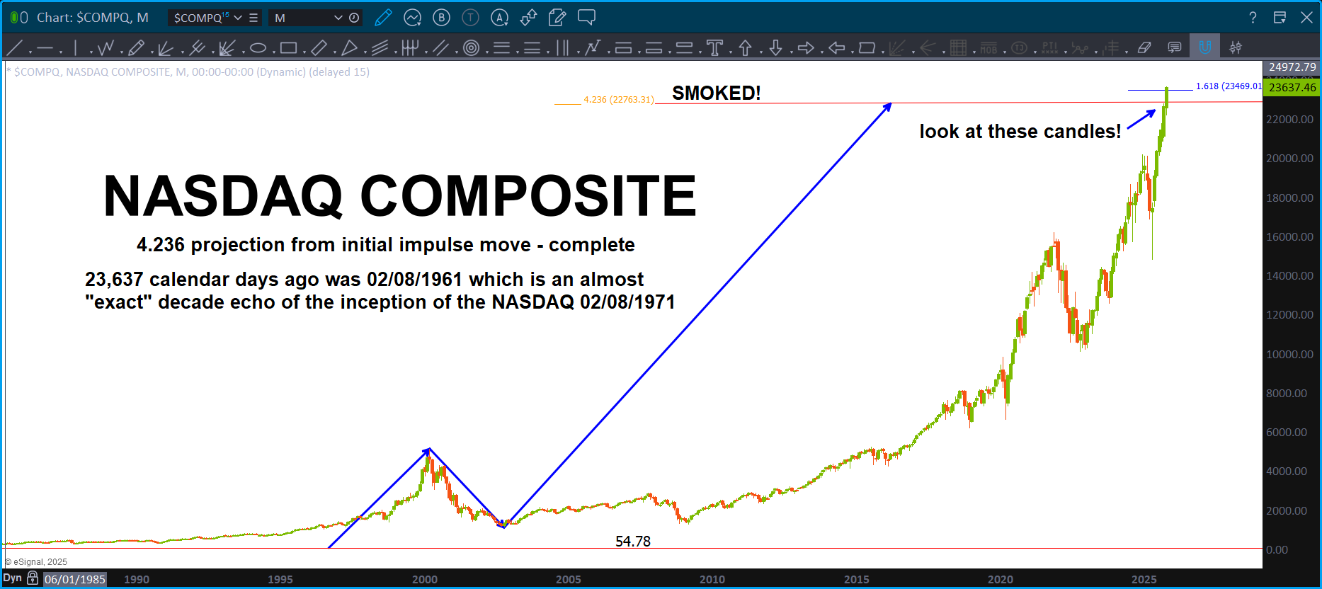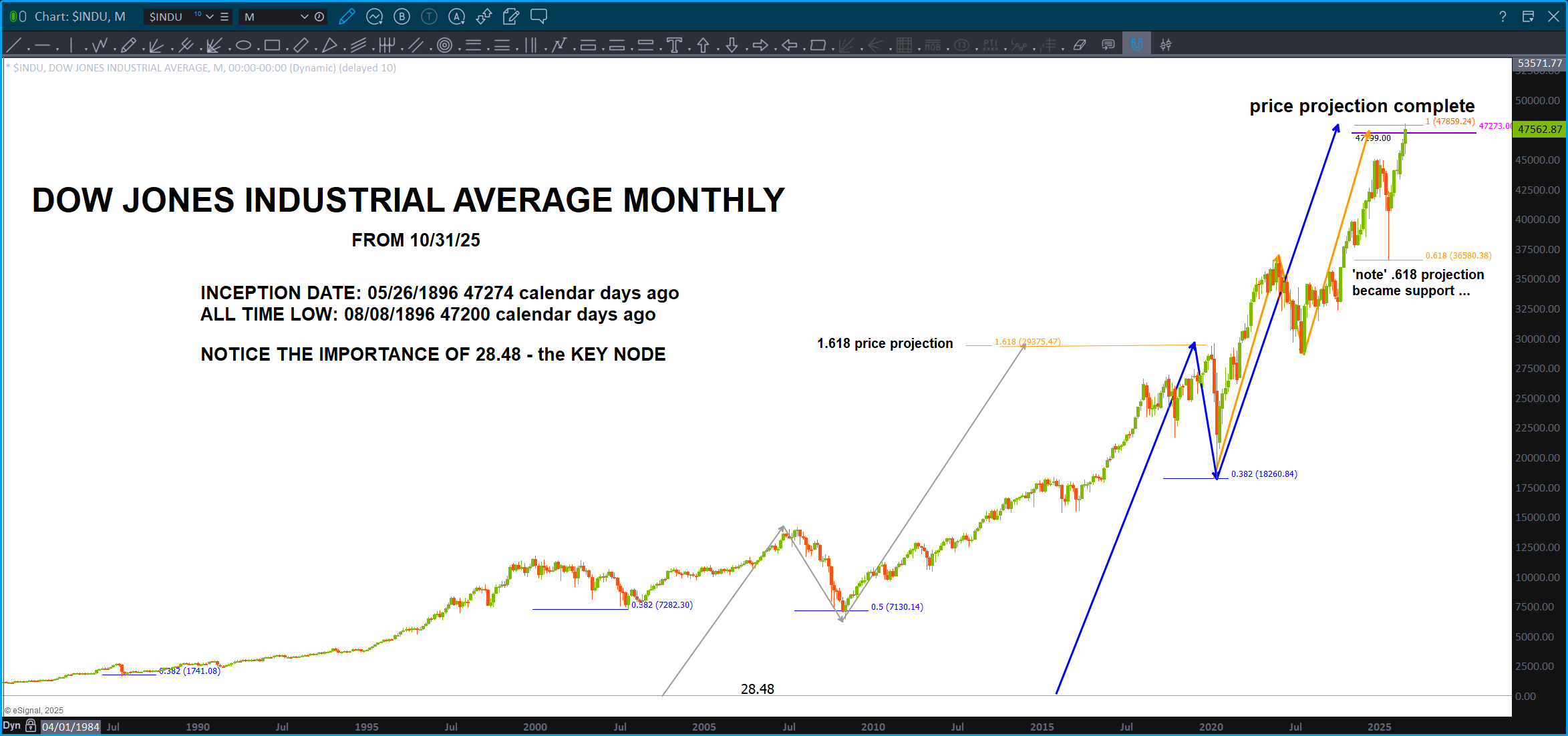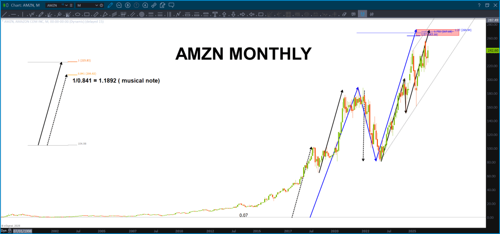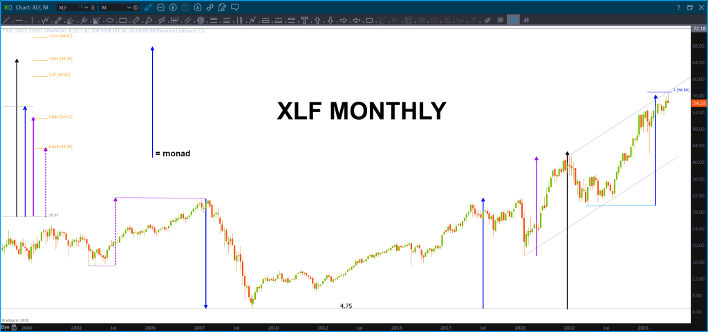 Last, look at the harmony w/ the ‘monad’ to the left of the screen. All the moves are harmonic to the solid blue arrow. Just stop and try to comprehend, what is going on here … this chart is bouncing around – somehow – with harmonic fractals to the measured move that nailed the top. Even look at the ‘red’ corrections – yup, the same.