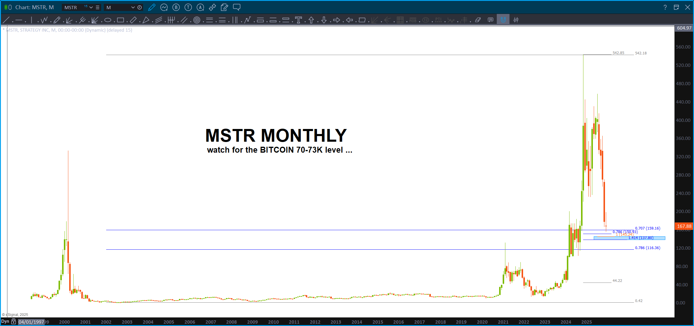 First test and, if bearish, should offer significant resistance is below. If we gap and go above that or just smoke thru it w/ ease then our map is orienting us to new highs in Bitcoin. Yes, I was looking lower for a VERY, near perfect, BUY zone in the 70K’s but w/ everything going on, it might not just get there. We’ll see … don’t forget that MSTR chart either. They kinda move together …