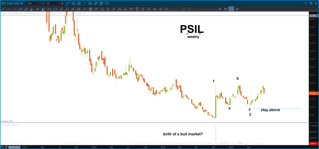 PSIL – I’ve been long for a while and just want to update you on ETF that tracks this nascent (trust me – VERY) sector. For this count to remain valid, price cannot close below “c” or less than 9-10 bucks. Big readout today. Check it out: