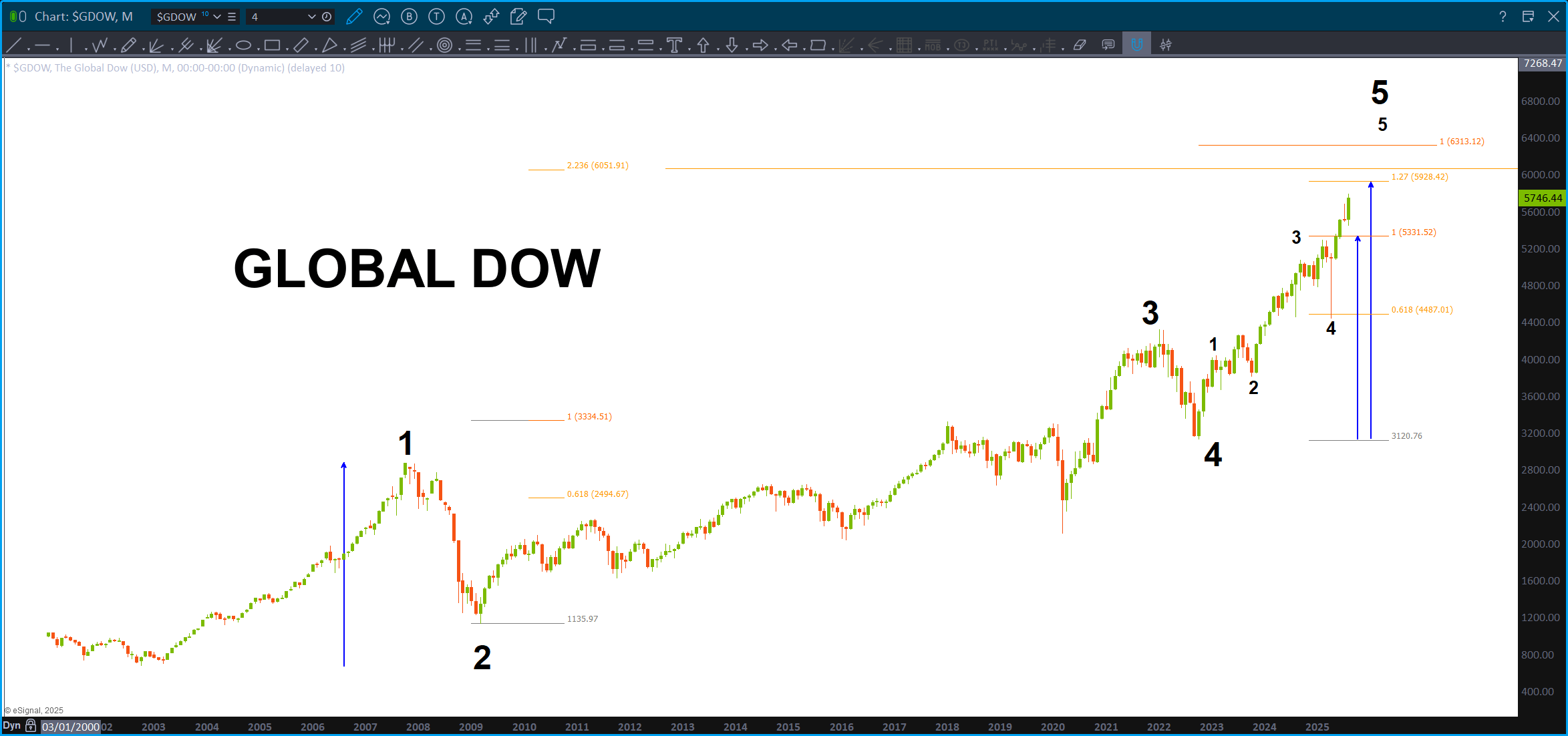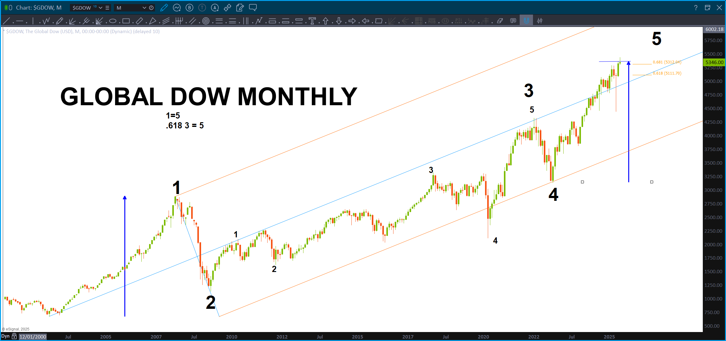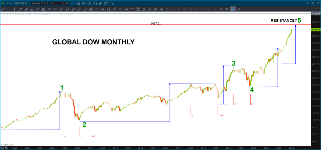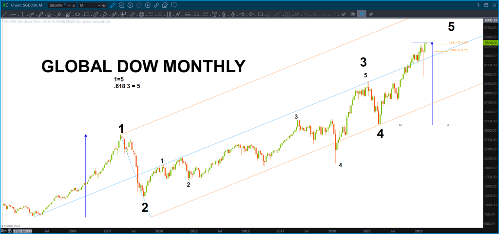 If you search on this site for the Global Dow you will see that I’ve been searching for a top in this index as it certainly appears, from a Ray Charles perspective, to be 1,2,3,4,5.