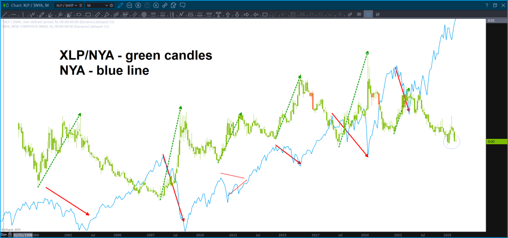 But, what’s been trusty as heck … the old XLP / NYA … and w/ a few days left in the month certainly appears that this will be a monthly close below the monster 10+ year support and is bullish for stocks.