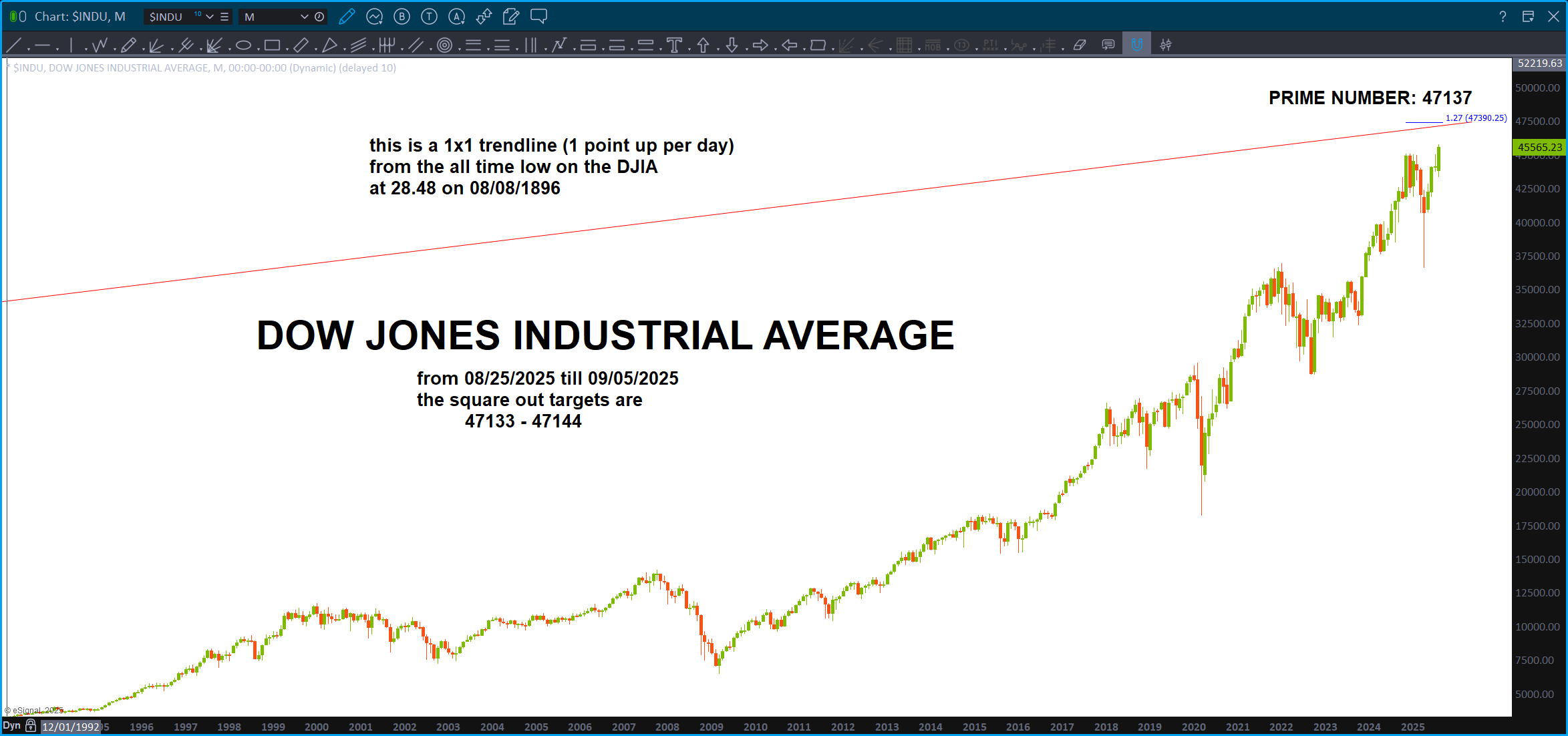 When you look at geometry, the SQUARE (90-23.4 = 666 – the tilt of our planet …hmmm ) is of utmost important. So, when we take a square w/ unit 1 on all it’s sides and put a 45 degree line on it we now have the Square Root of 2 or 1.4142. A KEY number sprinkled throughout creation – remember, even the very hairs on your head are numbered – so this 45 degree angle from its origin point when hit represents the perfect balance. In this case of a chart, that is when price equals time. It’s perfect …