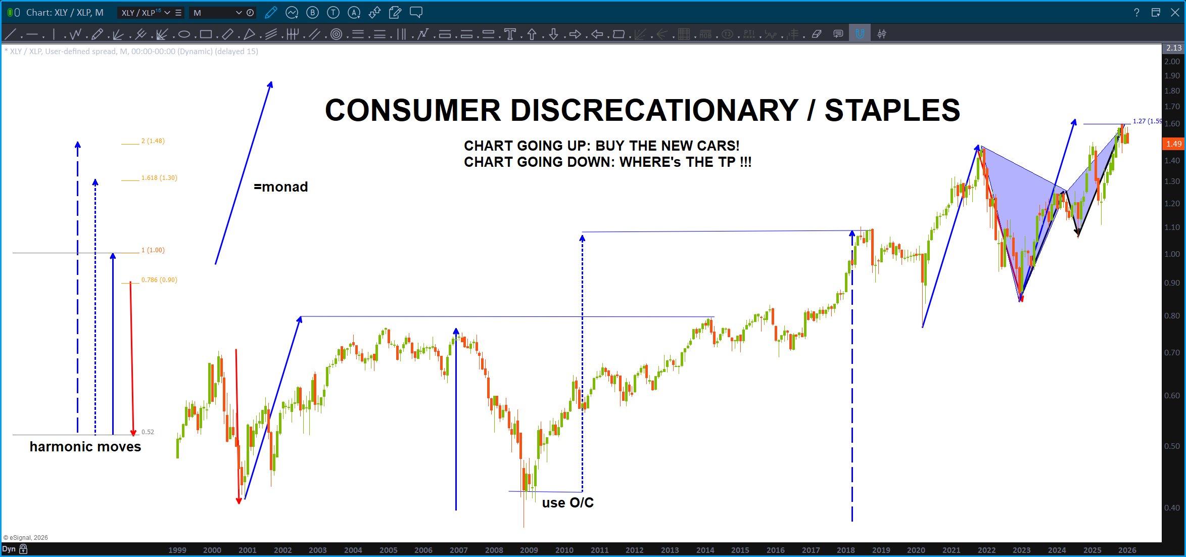 Folks, we have an ABCD (monthly) and a BUTTERFLY (perfect CD leg in price and time) along w/ a three drives to a top pattern. WOWZA …in normal terms, it appears that people aren’t going to be buying their new cars anymore because this ration has smacked into HUGE resistance.