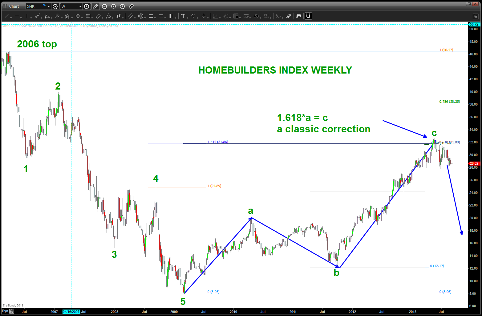 Homebuilder’s Index has “recovered” nicely, as has everything, from the 2007-2009 timeframe. That being said, we have a very symmetrical and orderly pattern that has recently completed on the weekly timeframe. Additionally, take a look at the daily timeframe – the classic head and shoulders pattern pops right out at you. Stay tuned, but perhaps the big bad wolf is about to pounce and blow the house down? Or, not ….