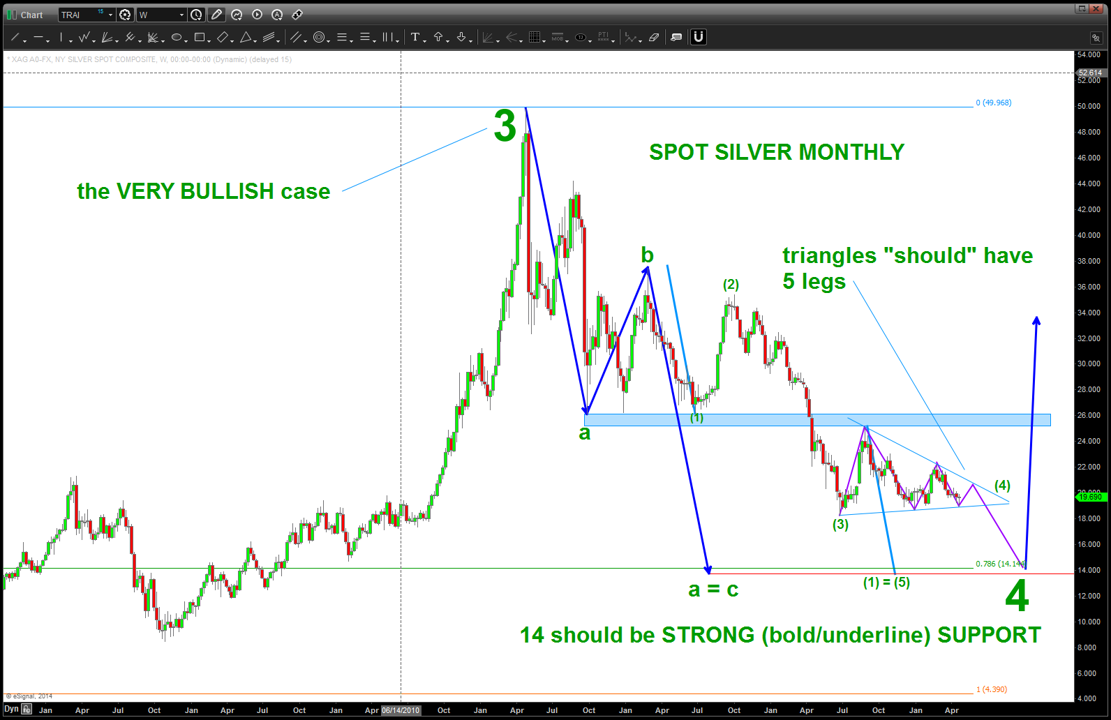 Cliff Notes: sure looks like a 4th wave triangle working out …a,b,c,d,e and we are in a rally up for e and then down into 14. EXPECT 14 to be BIG TIME support. Also, this is showing the high as 3. I have mentioned before I am really not sure if it was a 3 or a 5. BUT a BULLISH pattern is at 14.
