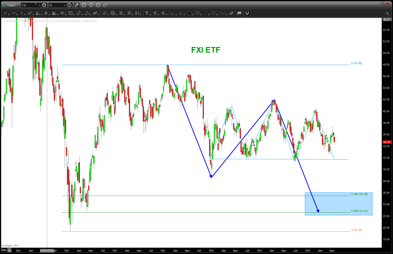but here’s what’s interesting … we have the Chinese Yuan FX pair causing quite the unwind and a representative ETF, FXI, of China is on a clff …here, take a look: