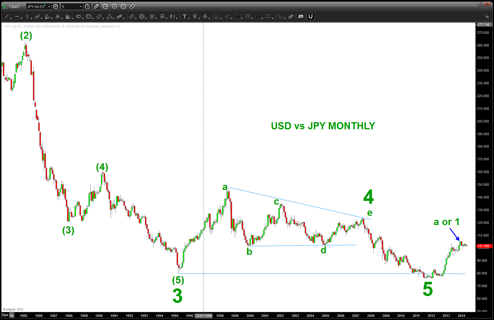 CLIFF NOTES: 99.40-99.80 is where we “should” see some support come in … take a review at the charts below. as you can see we have finished 5 waves up at the 105.40 handle. (note, see this chart below as the 5th wave was completing we were calling for it) so, since we have finished 5 waves up we are either at a 1 w/ 3,5 up to come and we are tracing out 2…or we just did an A and now we are correcting B for a C wave UP. Also note, we are a couple days (max) away from the same amount of TIME that the triangle shown below formed and completed. So … it’s going to get interesting, to say the least. Personally, I wish this pattern was completing lower as the DEPTH of the correction isn’t as big as I would think but is that a sign of the overarching bullishness? hard to say ..but from a TIME perspective we are finishing up the same amount as the triangle. Keep an eye on this one ….