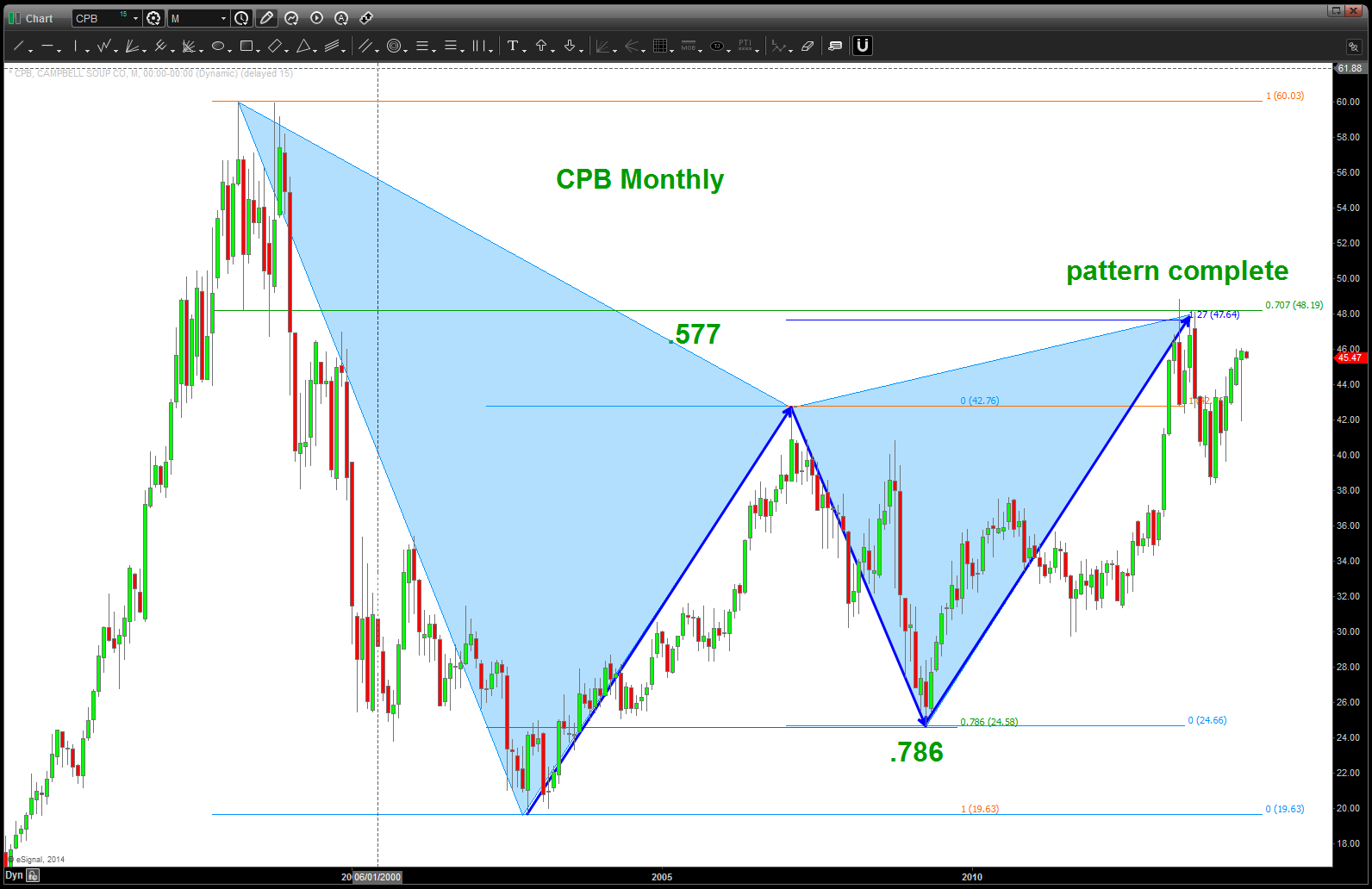 CLIFF NOTES: here is the post showing the pattern completing and the short that was recommended. https://bartscharts.com/2013/09/17/soup-is-good-food-campbell-soup-at-key-level-cpb