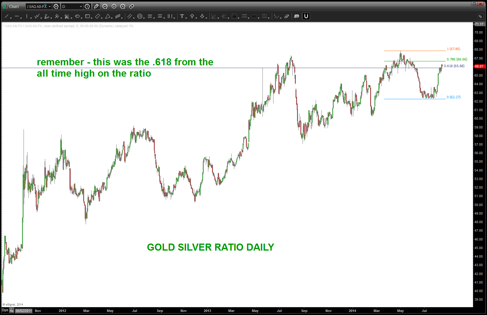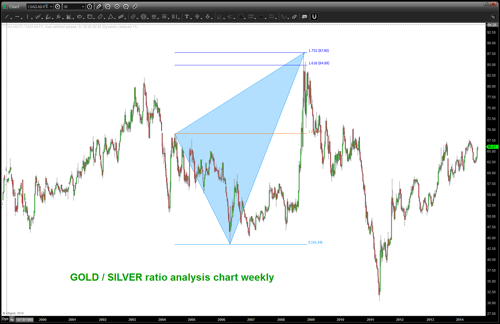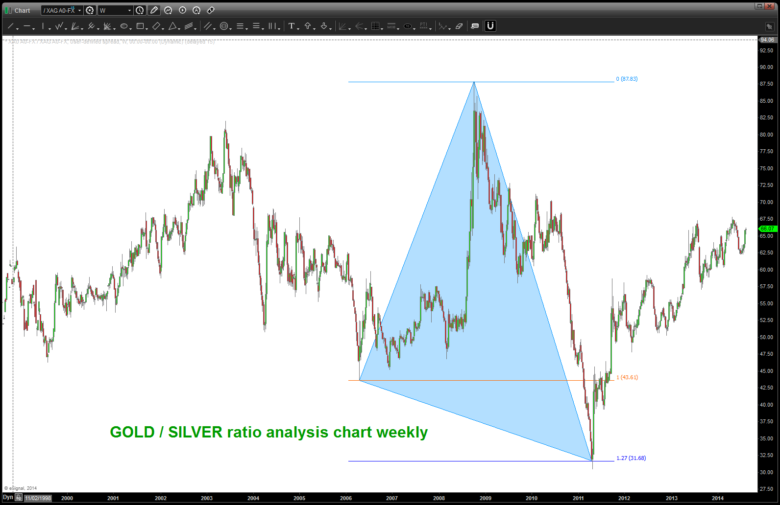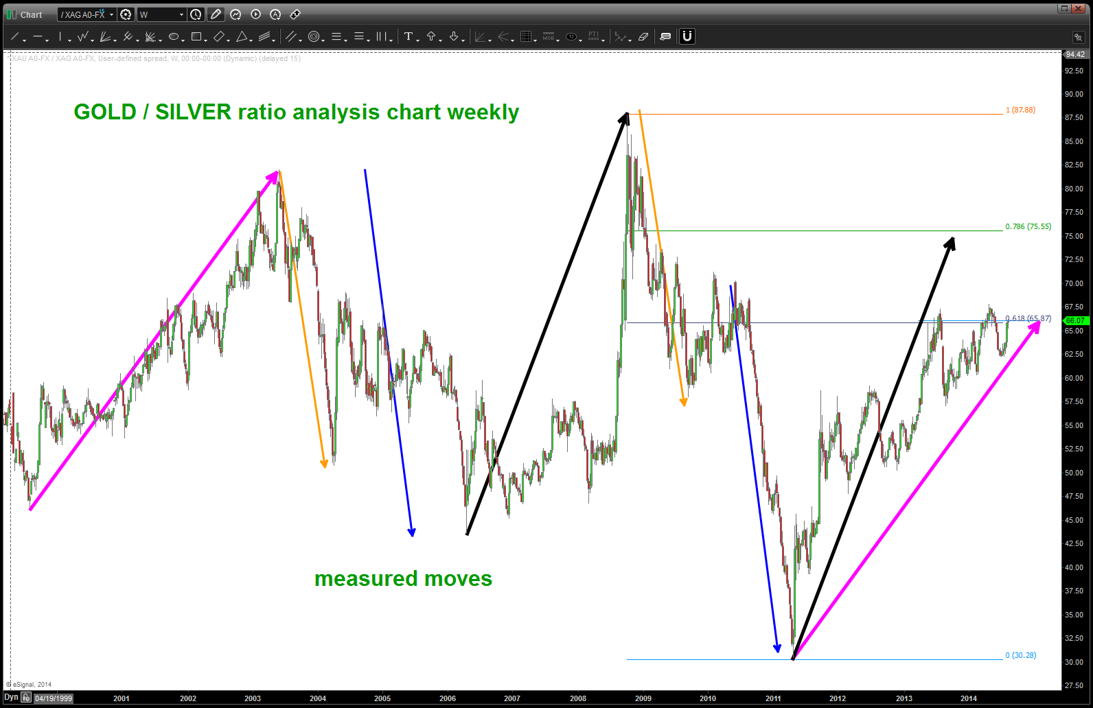so where are we now …? Just using basic measured moves we can see that EVERY move in this ratio has been “used” before so our trick is to find out which one might work or not. Note the downward blue and orange arrows … then note the crash and how the vectors were almost perfect. so … we “should” do either the black or the purple measured move UP –right? note we are at the .618 of the gold/silver ratio and the black arrow would take us up to the .786. One of those two levels “should” hold and cause an inflection in the ratio. See below: