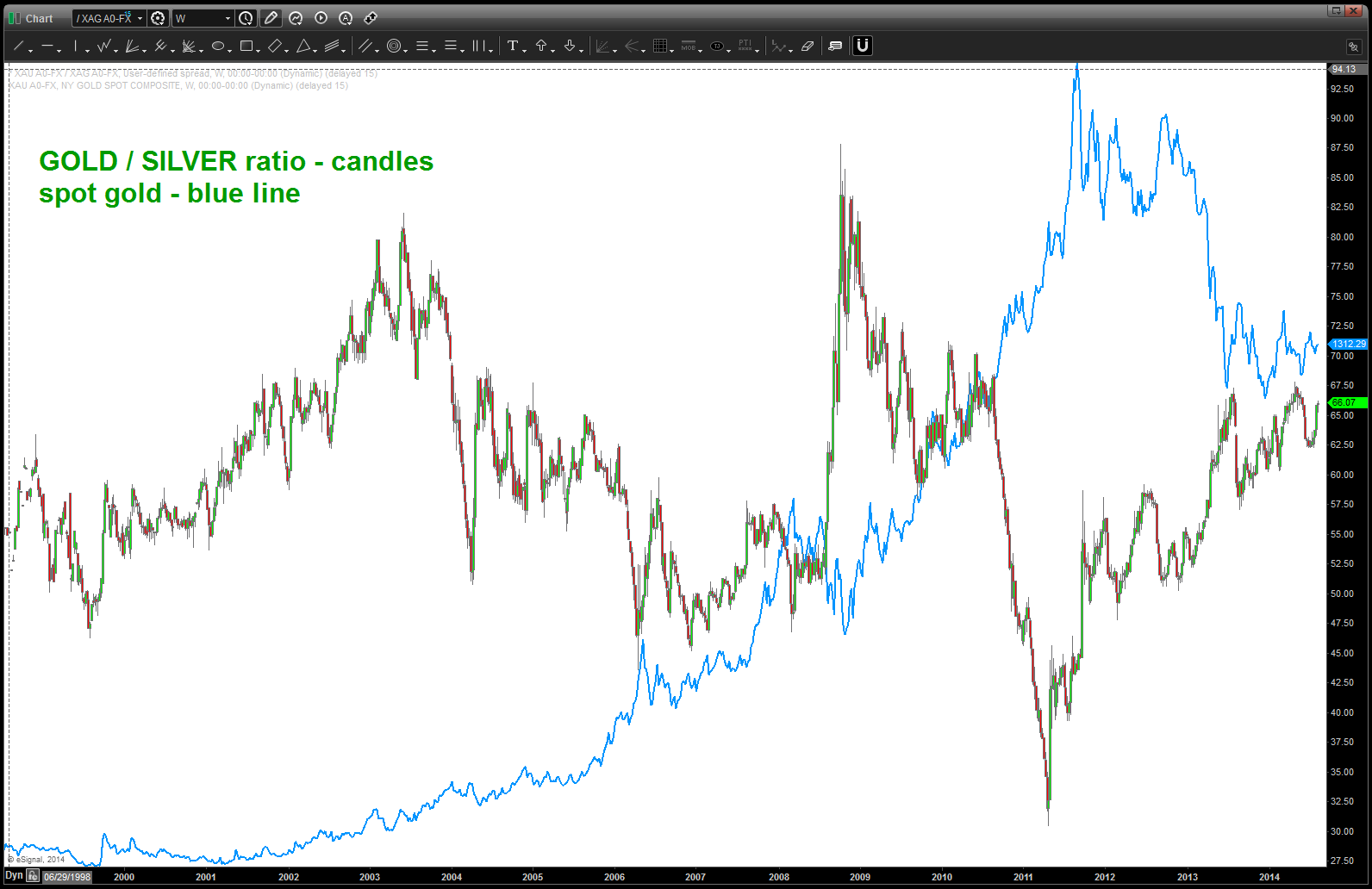 CLIFF NOTES: a case is made, below, that inflection points in the ratio of GOLD/SILVER cause big movements in the spot gold and silver prices. Also, it appears that Gold lags. We are at a resistance level which “might” be one of those inflection points so expect the metals to get moving NOW or SOON. Probability points “lower” across the board for the metals.