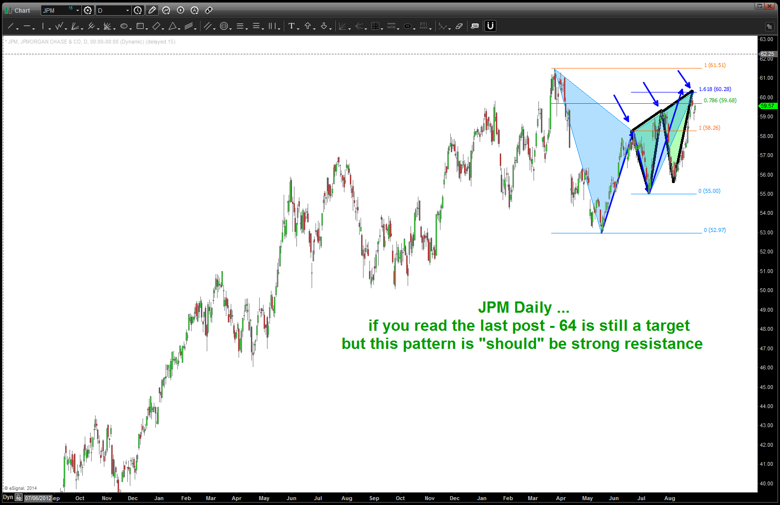 August 29 2014: when we use PATTERNS on weekly and monthly charts PATIENTS is a must. If you take a look at the thread below, the JPM PATTERN was identified back in November 20013 and then didn’t hit for 4 months. It hit, perfectly, and fell roughly 20 percent. The rally has been roughly 203 months and now we have hit a KEY area for this to be ready for the next move down. Last, remember, 64 is still a longer term target so this PATTERN could fail and attack that number. Either way, we have a Gartley (blue shaded area) and a three drives (black w/ green shaded triangles) after a MONTHLY Gartley and Butterfly Pattern .. probability is this level holds. We don’t know, we know we have a PATTERN and leave it at that.