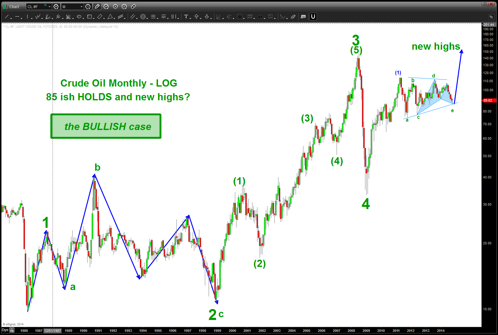 10/2/2014: we are at a very crucial junction w/ regards to Crude Oil. the big picture is resolving and, quite frankly, I’m not sure which BIG directional move to favor so i’m just going to TRUST the PATTERN that might have completed today. There’s an interpretation on IF the patterns works AND if the pattern doesn’t work but either way, believe we have a “line in the sand” so to speak from which to draw our conclusions and watch for confirmation in any direction. That’s why we are technicians – let PRICE and TIME be our guide.