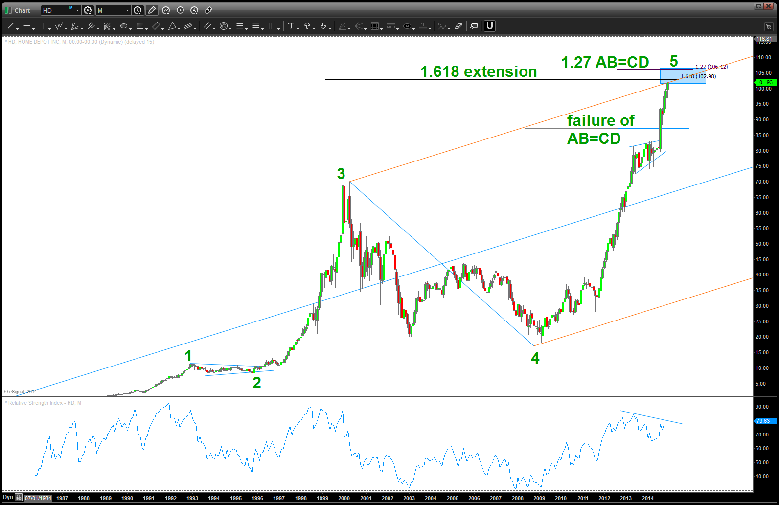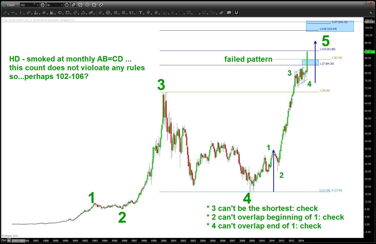 Cliff notes: major pattern from all time low on HD got smoked at 85-87. HOWEVER, let’s take a look at what the long term is showing …it’s showing 5 waves folks so in/around here 105-110 or 130 this should represent an end of move. But for now … anyone got a “cut man” for the corner?