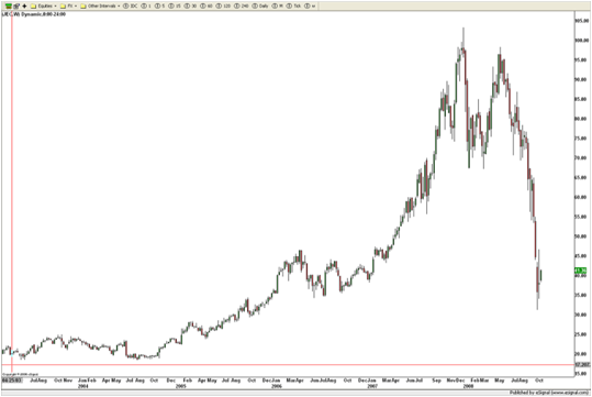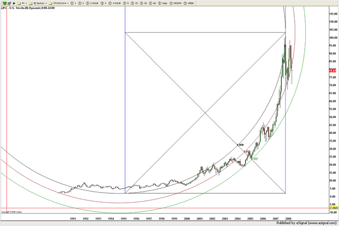 First chart is JEC … the first chart was showing the parabolic nature of the move and how it was pretty much done. Now, note the very nice symmetry of the move down from the high. so that “last” move up going from the top and down left to right is EXACTLY equal to the move in the “current” time and the “are we here.” Rest was history …