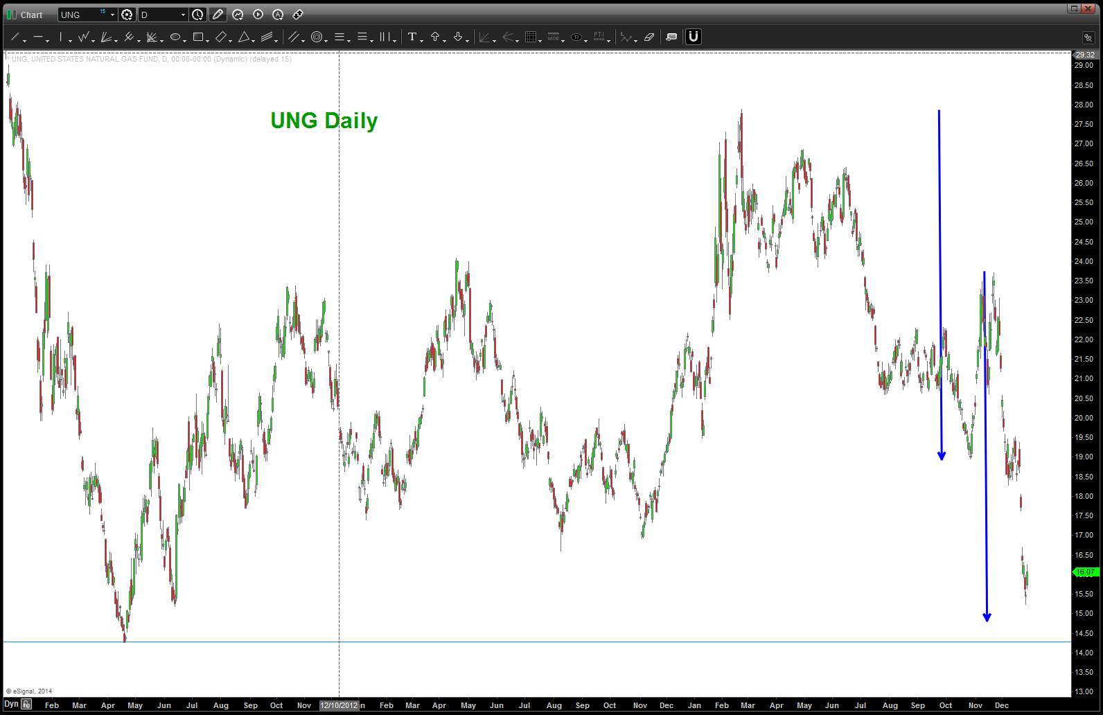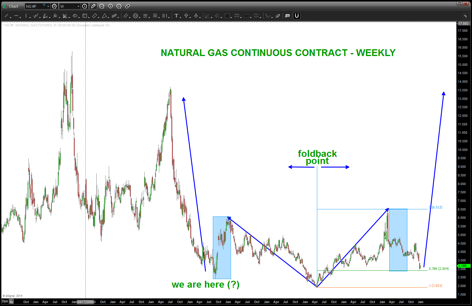 if (the big if) the mirror image is at play THEN either 1) here or 2) a little lower and we should see Natural Gas foldback up the blue arrow shown by the “we are here (?)” in the middle of the chart.