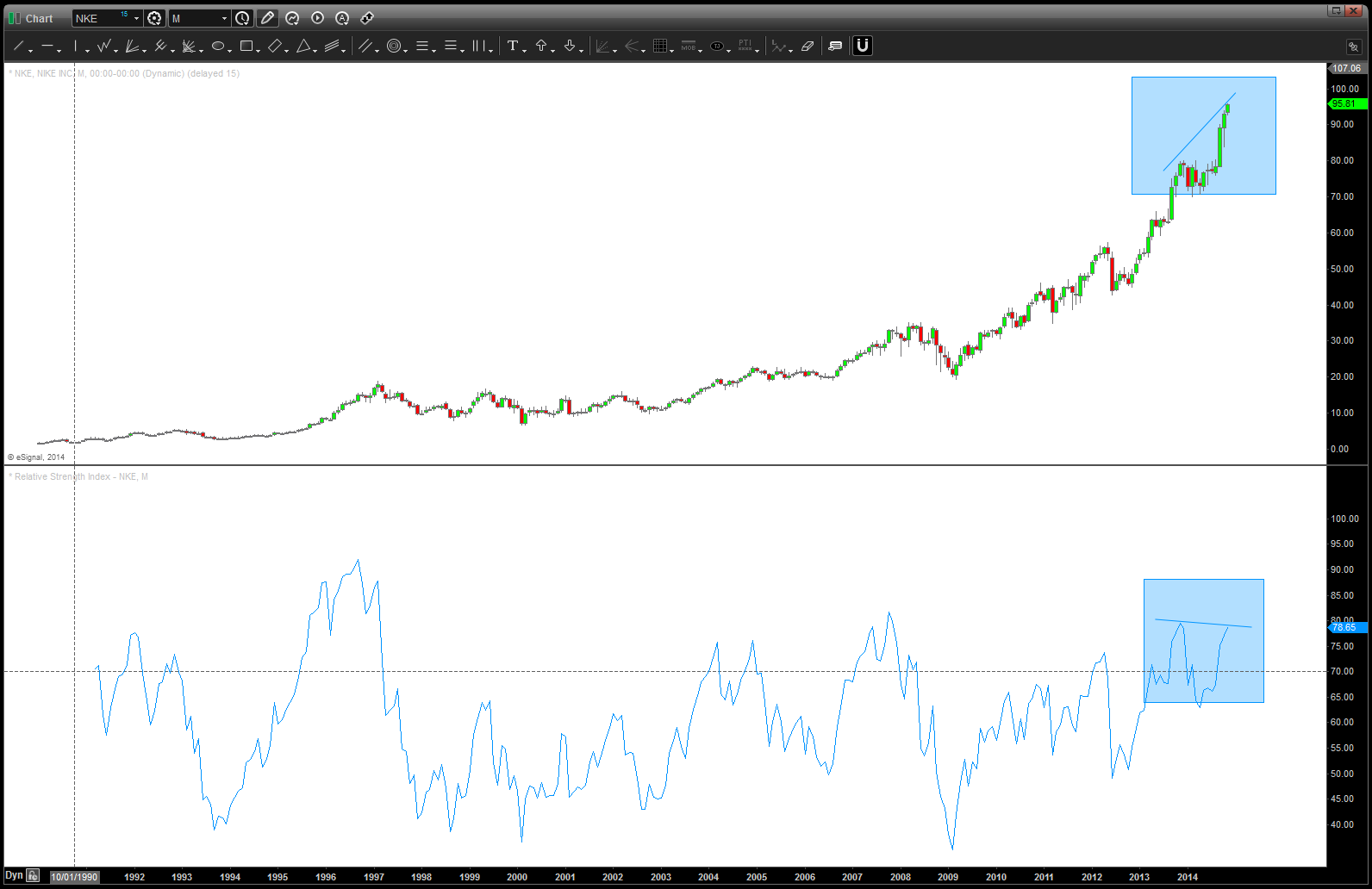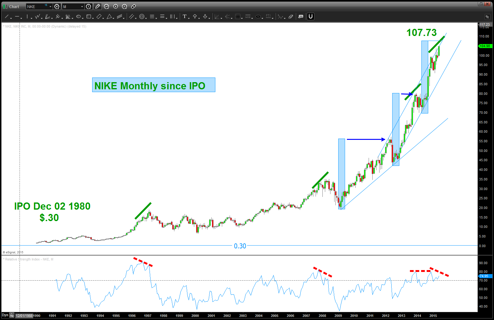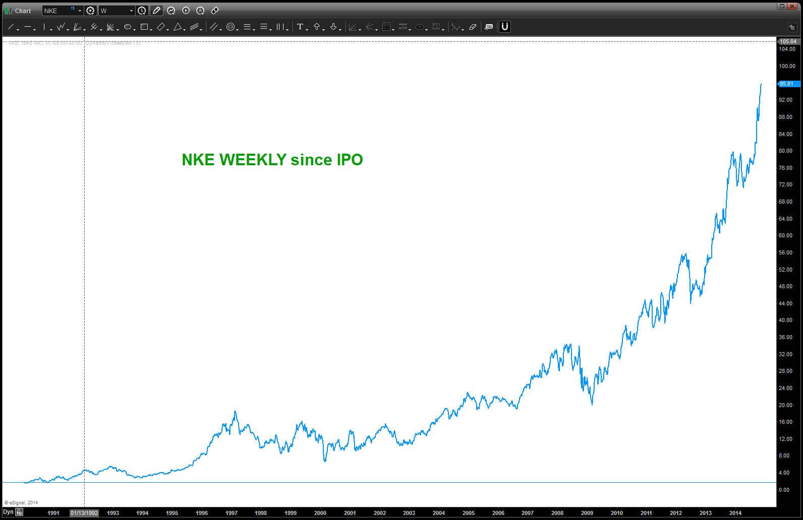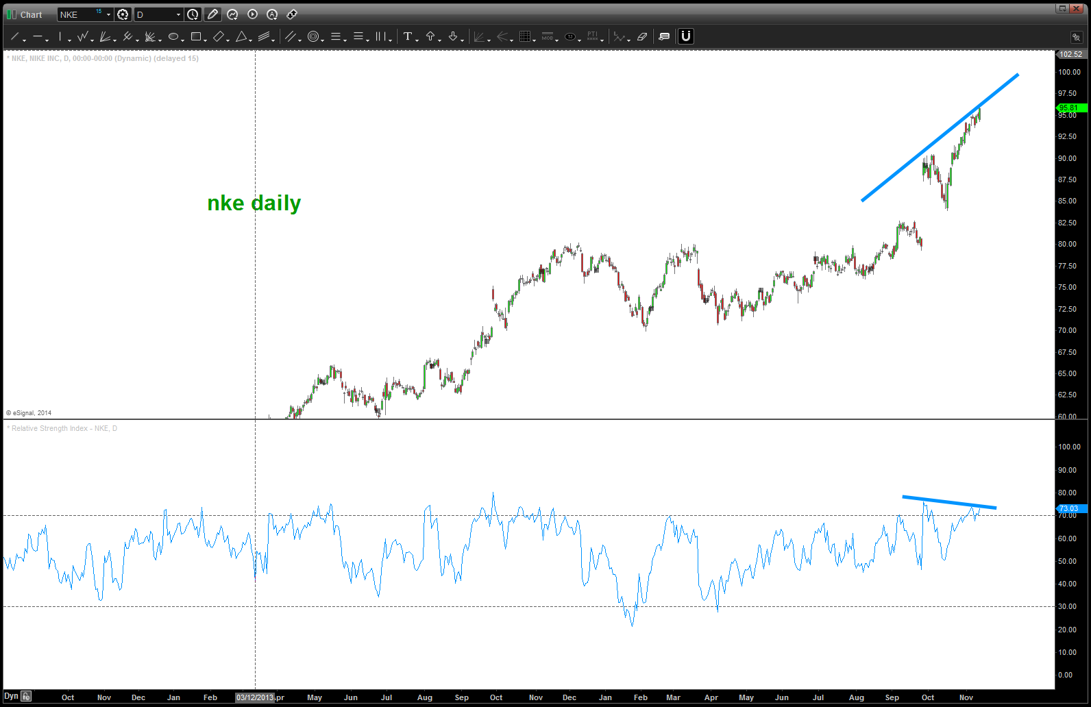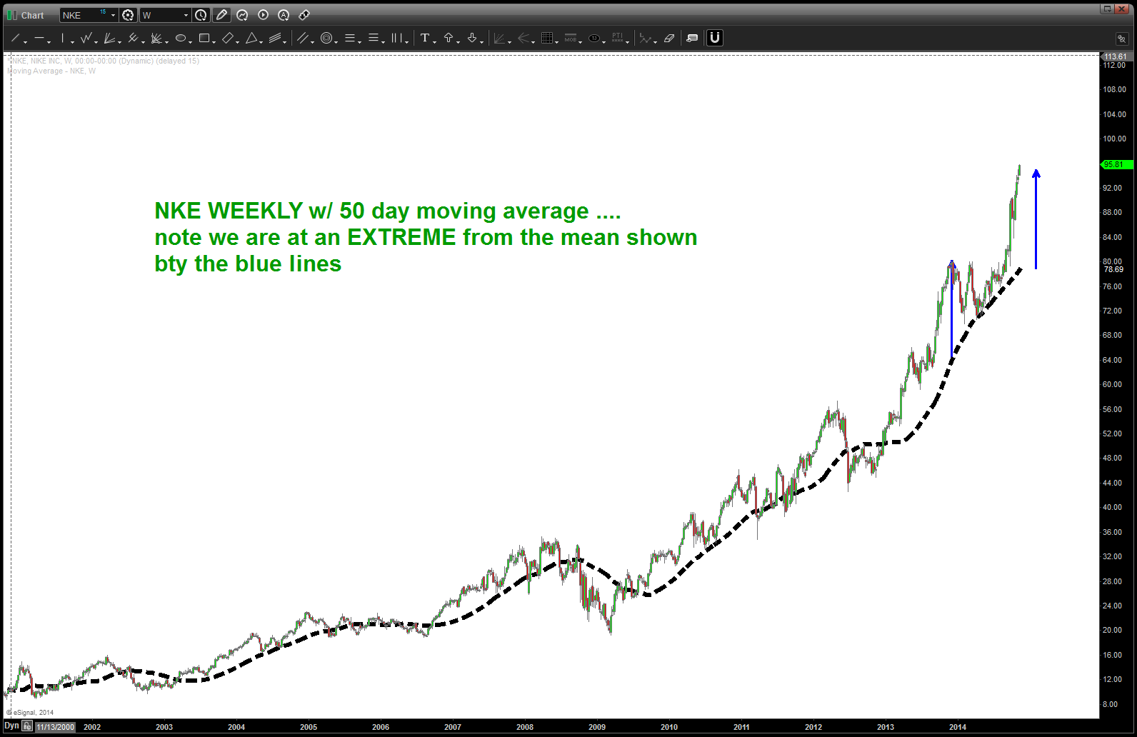 - I have NEVER done this exercise on Nike (NKE) Fact is I like Nike, just bought a pair of running shoes the other day and they employ my daughter at the local outlet mall. But, shoving that all aside – it’s parabolic and that’s just not good.