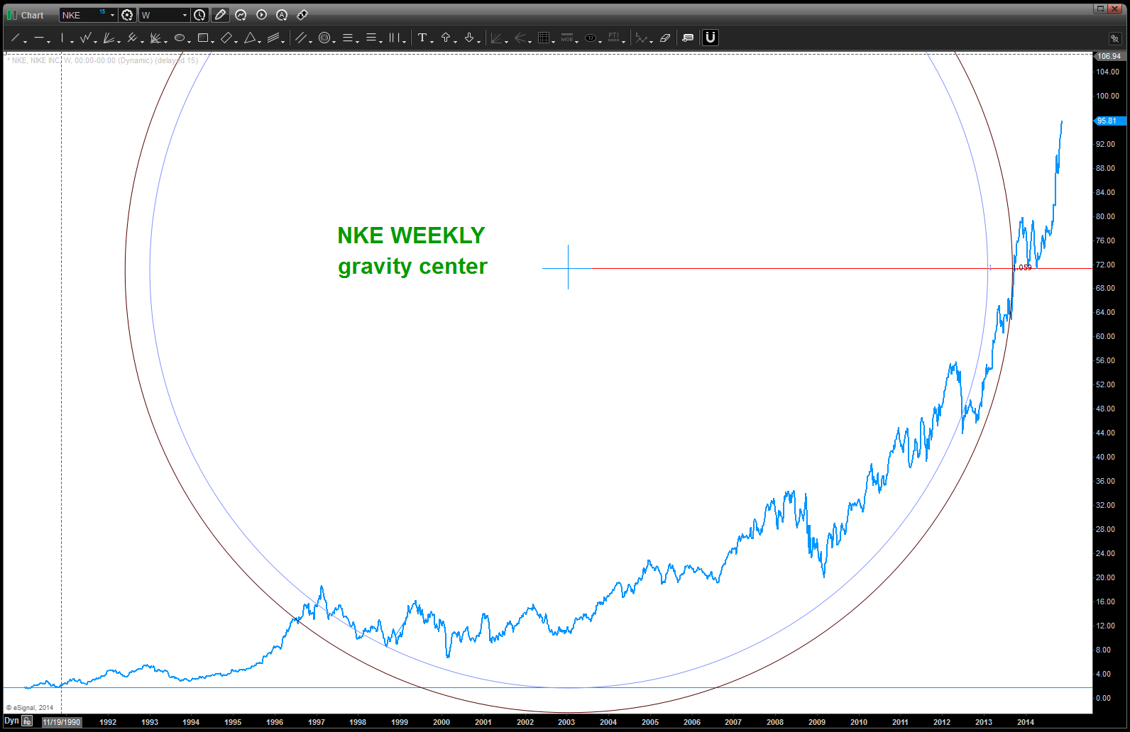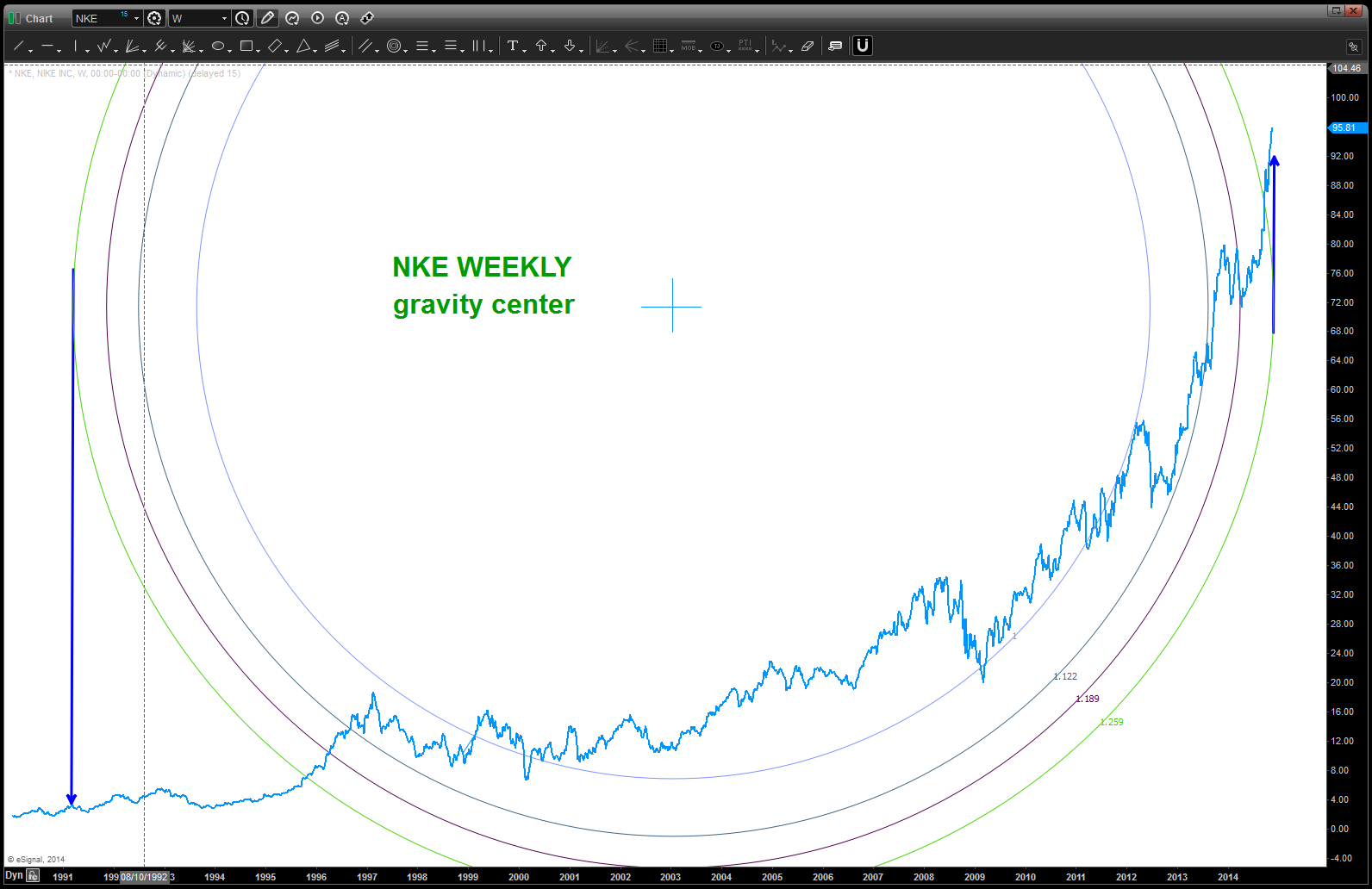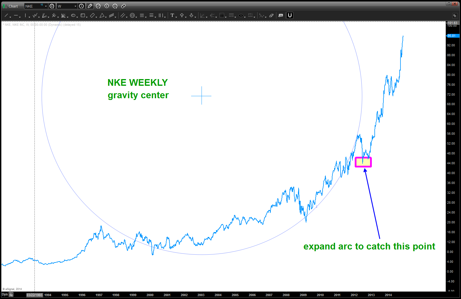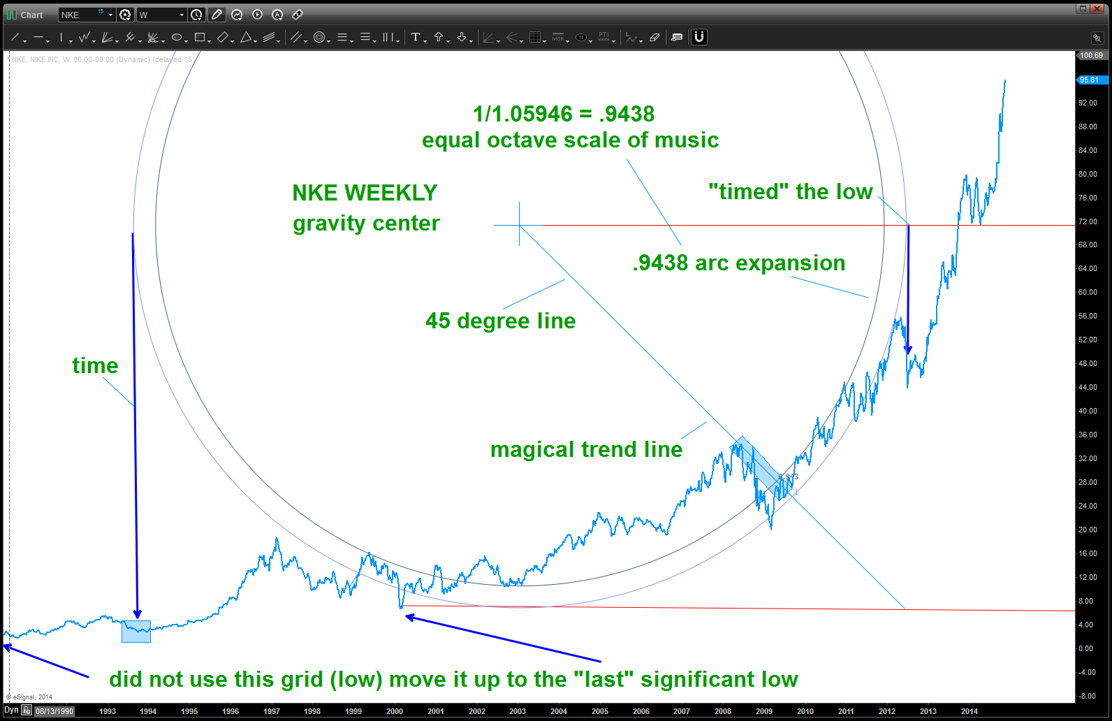 3. Here’s the picture w/ the gravity center and the arc shown. I don’t like it, you’ll see why. So have we done something wrong? No, just not using the right grid. Do you see how the all time lows did their own “mini” parabolic run back in 1997? So, decided to shift up the low horizontal grid line to the “next” low and … look two charts lower. Please pay attention to the annotations on the chart.