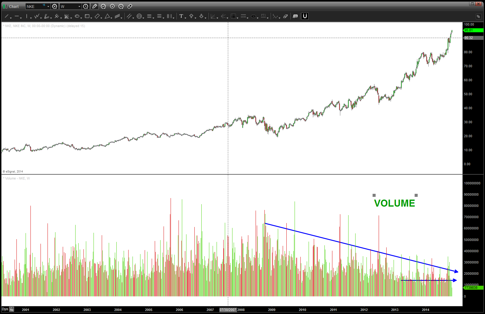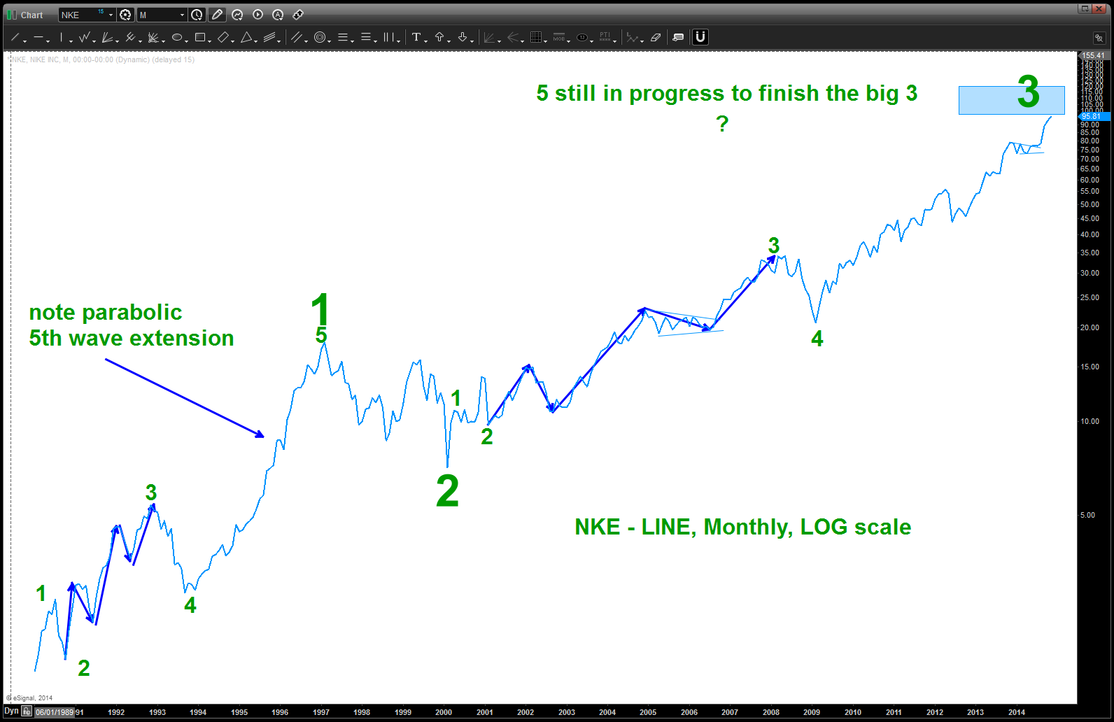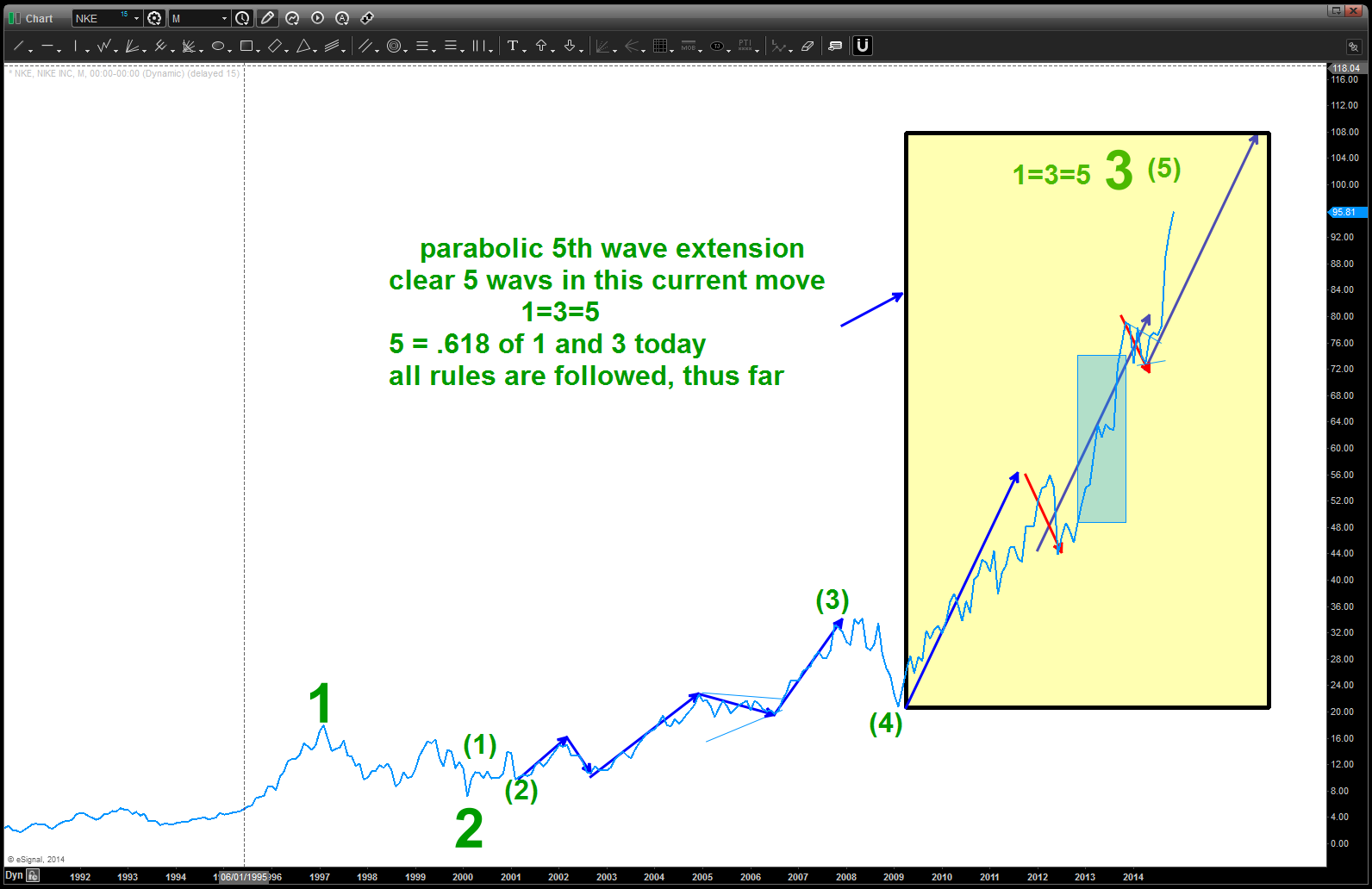 so, in conclusion, we are parabolic and another 10% move up – really quickly – is not out of the question. Believe the first hint of a SIGNAL REVERSAL CANDLE (weekly) would be time to take profits and, remember this is 3 of 5 (if my count is correct) so I will be looking to BUY NKE after the inevitable pull back in any parabolic.