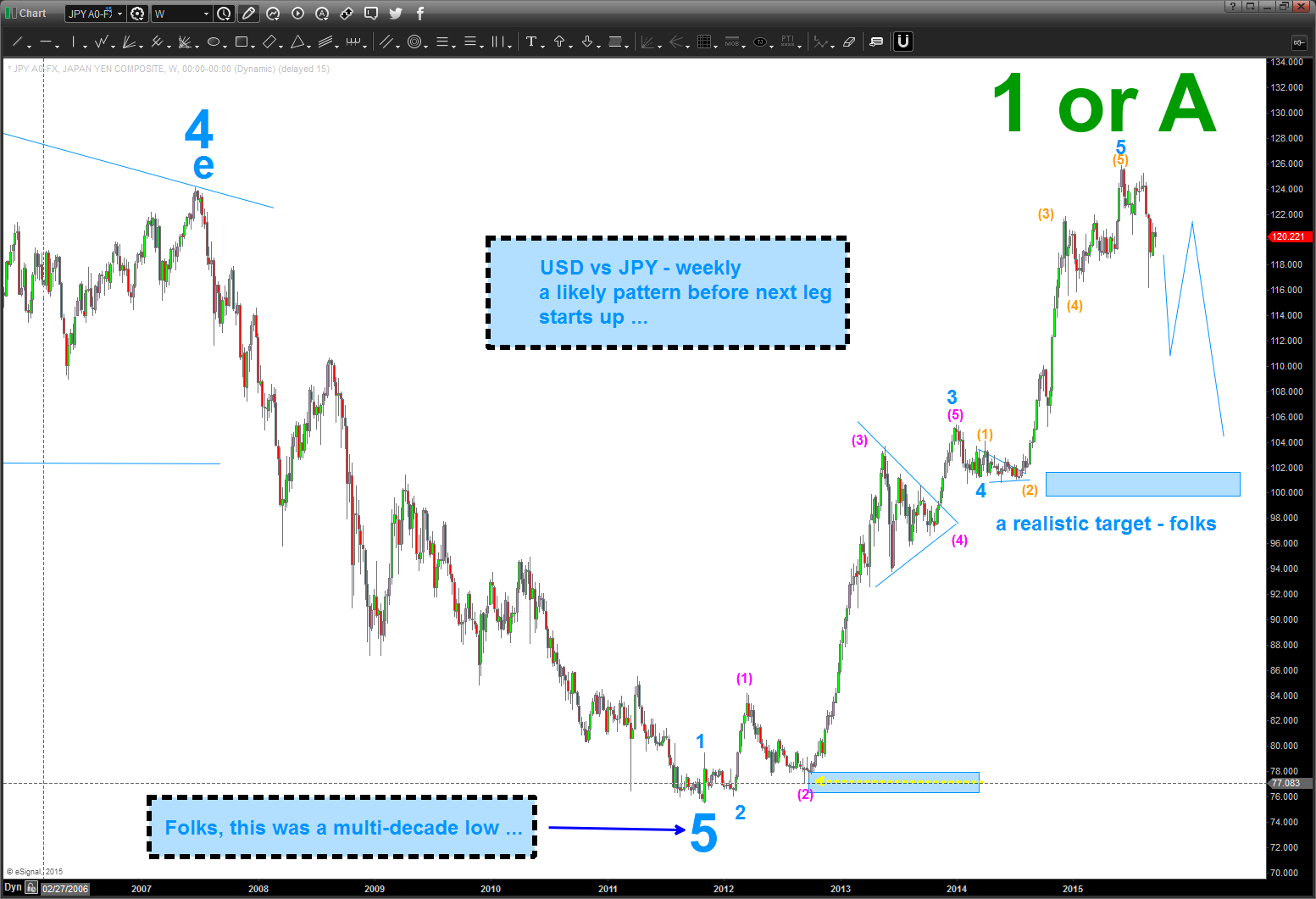 After you digest his blog post, if you still feel like it, take a look at these two charts. My thesis – we have completed a pretty big high on the USD vs JPY. Do a search on the YEN on my post and you’ll see I’ve been following this count pretty well. Why is that important? Well, because it’s time for true confessions …