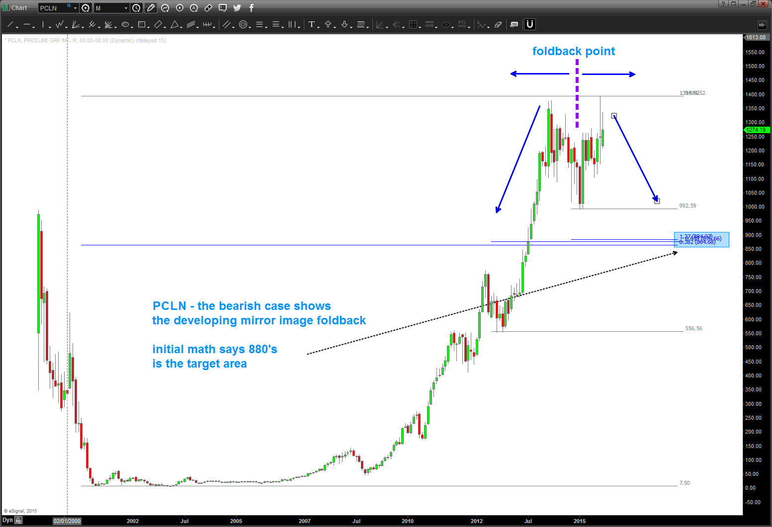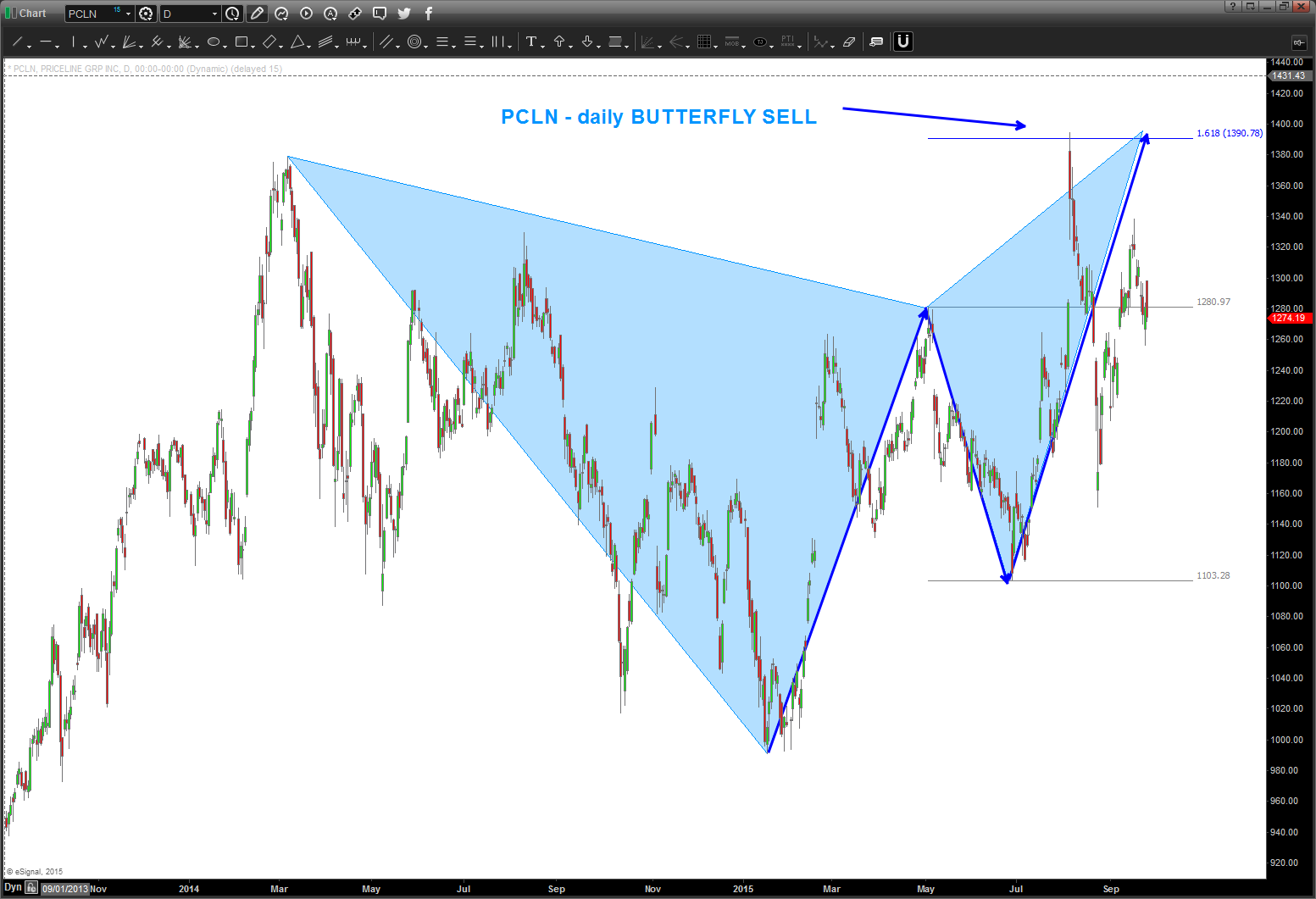 here’s the POTENTIAL mirror image appearing on $PCLN. Note, the second chart shows the “daily butterfly sell” that is “causing” this … this will be a very good one to watch. These patterns all fail when the high is taken out .. all probability folks.