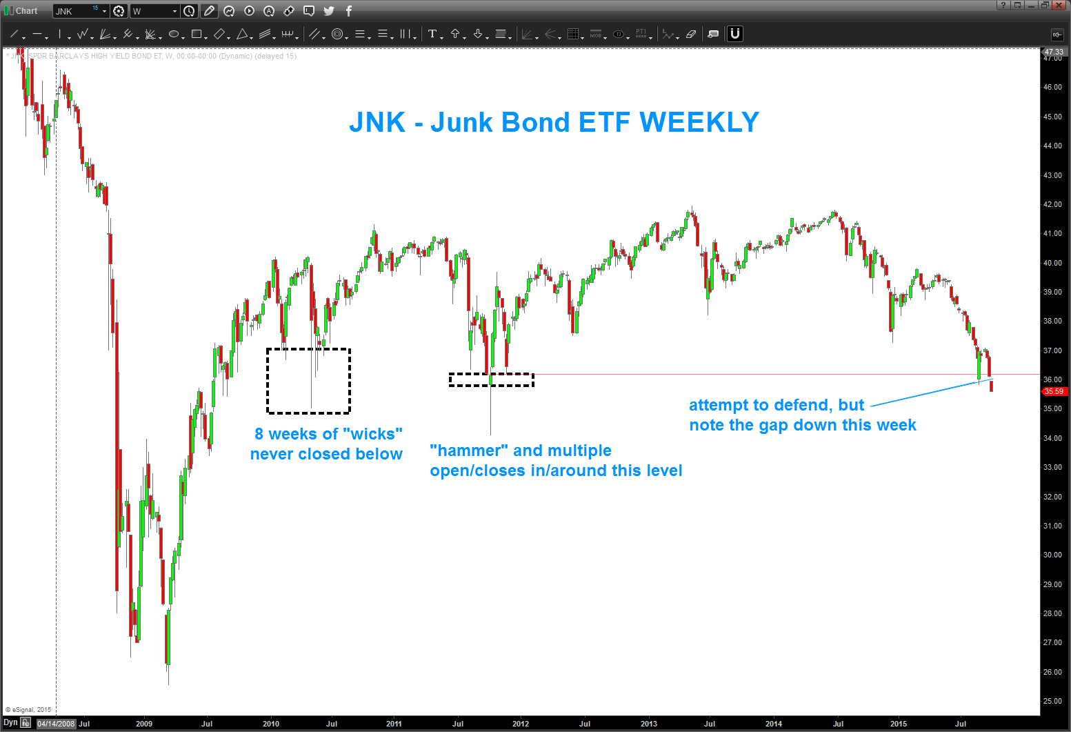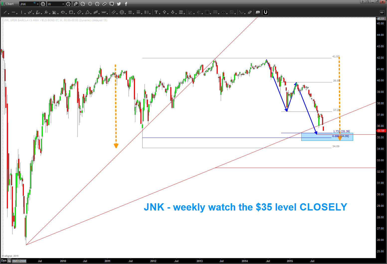 over in the states we also need to watch a very key level in the JNK ETF. Essentially, Junk Bonds are risky low grade bonds and show the appetite of the credit markets. In this day and age of grabbing for yield, somewhere, they have offered a speculative means to grab some yield, maybe. But in times of volatility they fall out of favor … as you can see by the chart below, the $JNK ETF is getting ready for the test of a very key level – 35. It’s nothing more than a pattern but you can see since the “recovery” of 2009 this level has been key. Watch this level, closely.