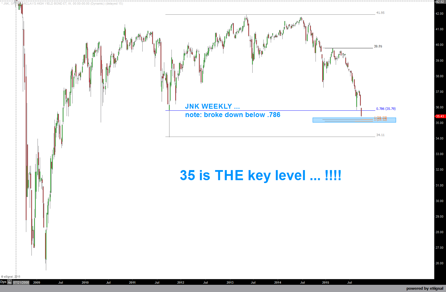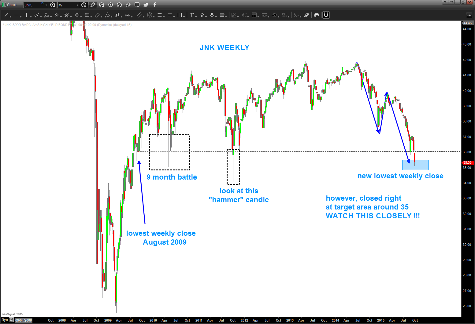 Junk Bonds … just think of em’ this way…risk investments and a yield play. in a volatile world, they aren’t so smart so institutions try to get out of them. keep it simple … note coming into the 2009 low they were crashing .. a nice bounce and then meandered around into June 2014 then started to crack. Most recent price action has seen some heavy selling pressure w/ the first noticeable gap down occurring last week AND (this is important) the lowest weekly close since August 2009.