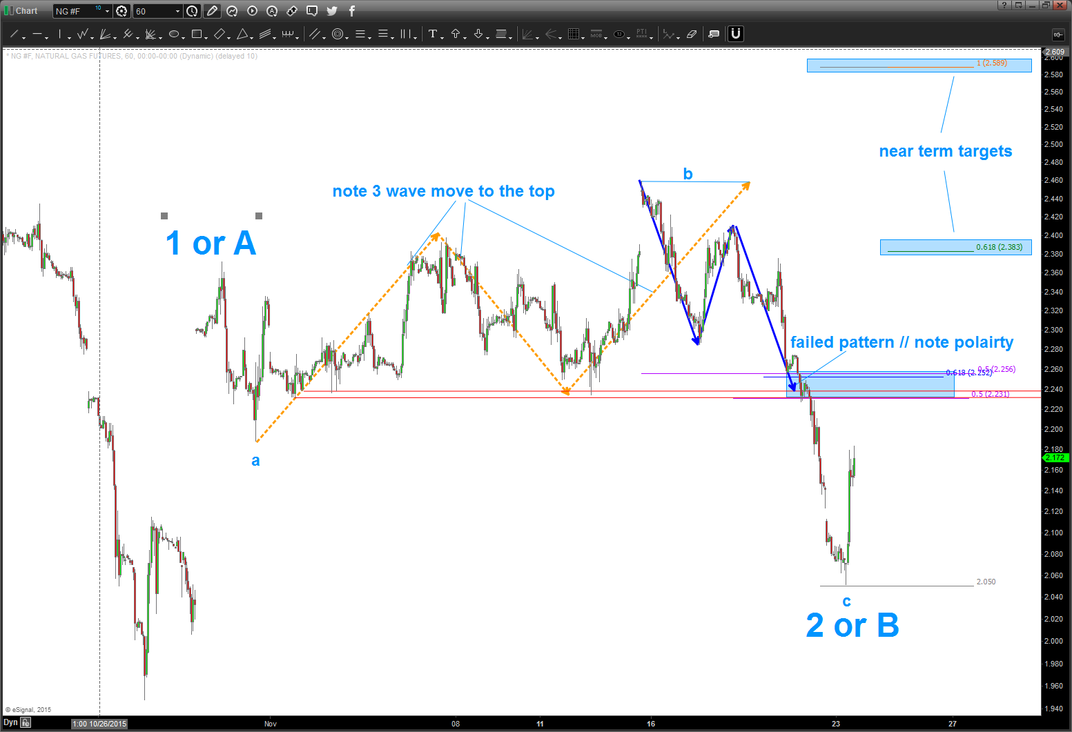 - see the 3 waves to a top at (b)? that is a classic “b” wave and action after that top sure smells like a C wave. Thus, at 2 0r B if we are bullish then this level will hold and we should continue to start up.