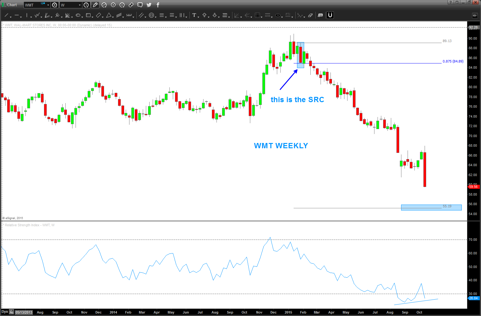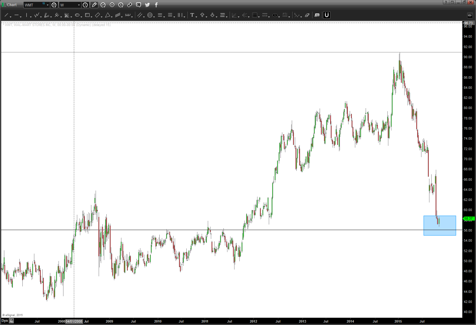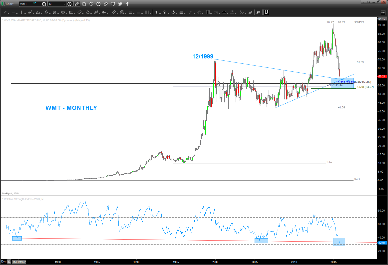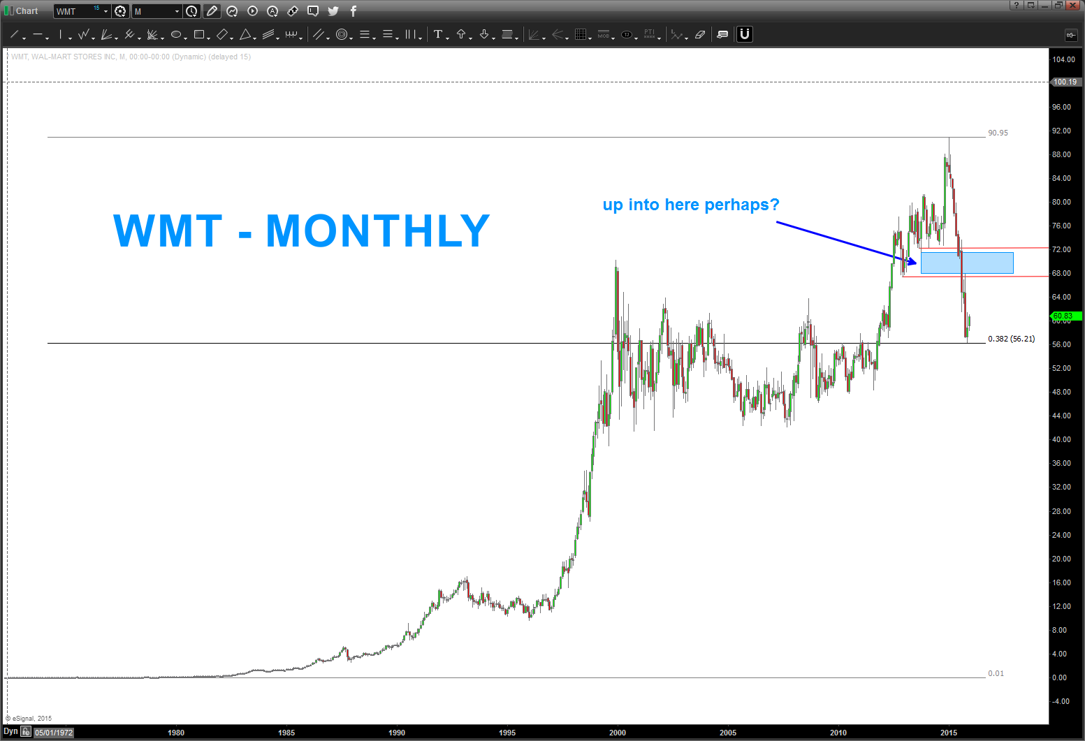Here’s the picture of $WMT in 2013 – sure looked, at the time, we were finishing 5 waves and the circle area was the target area for a “potential” top.