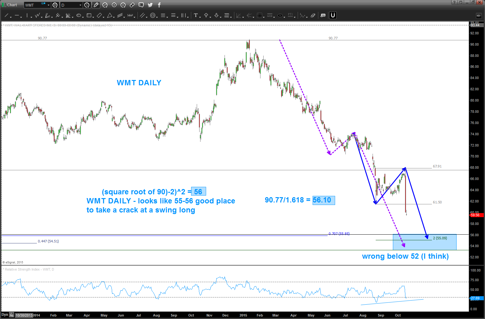 Here’s the daily chart … note the square root target of 56 lands right on the .382 retracement from the all time low. I like that … watch that 55-56 level.