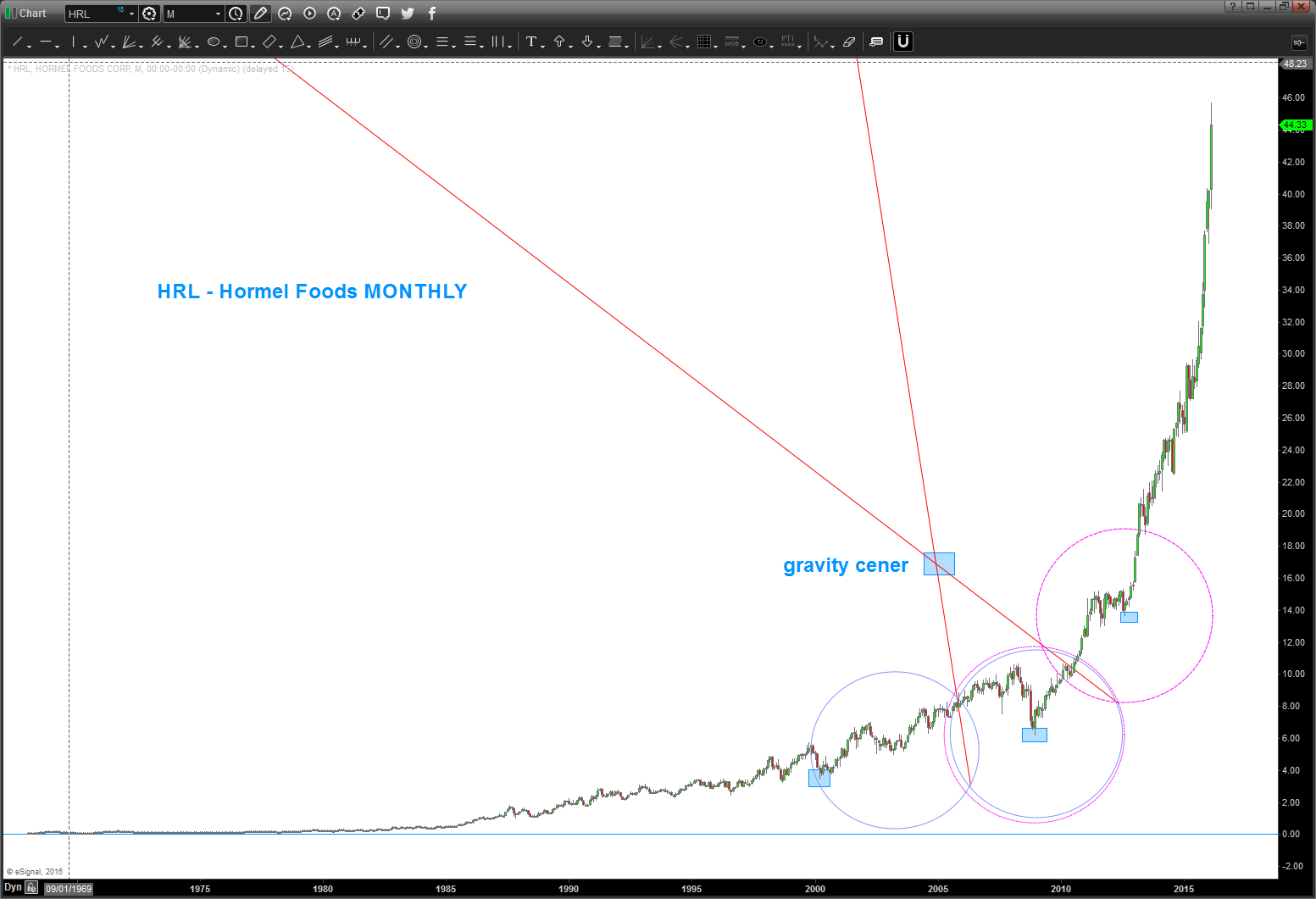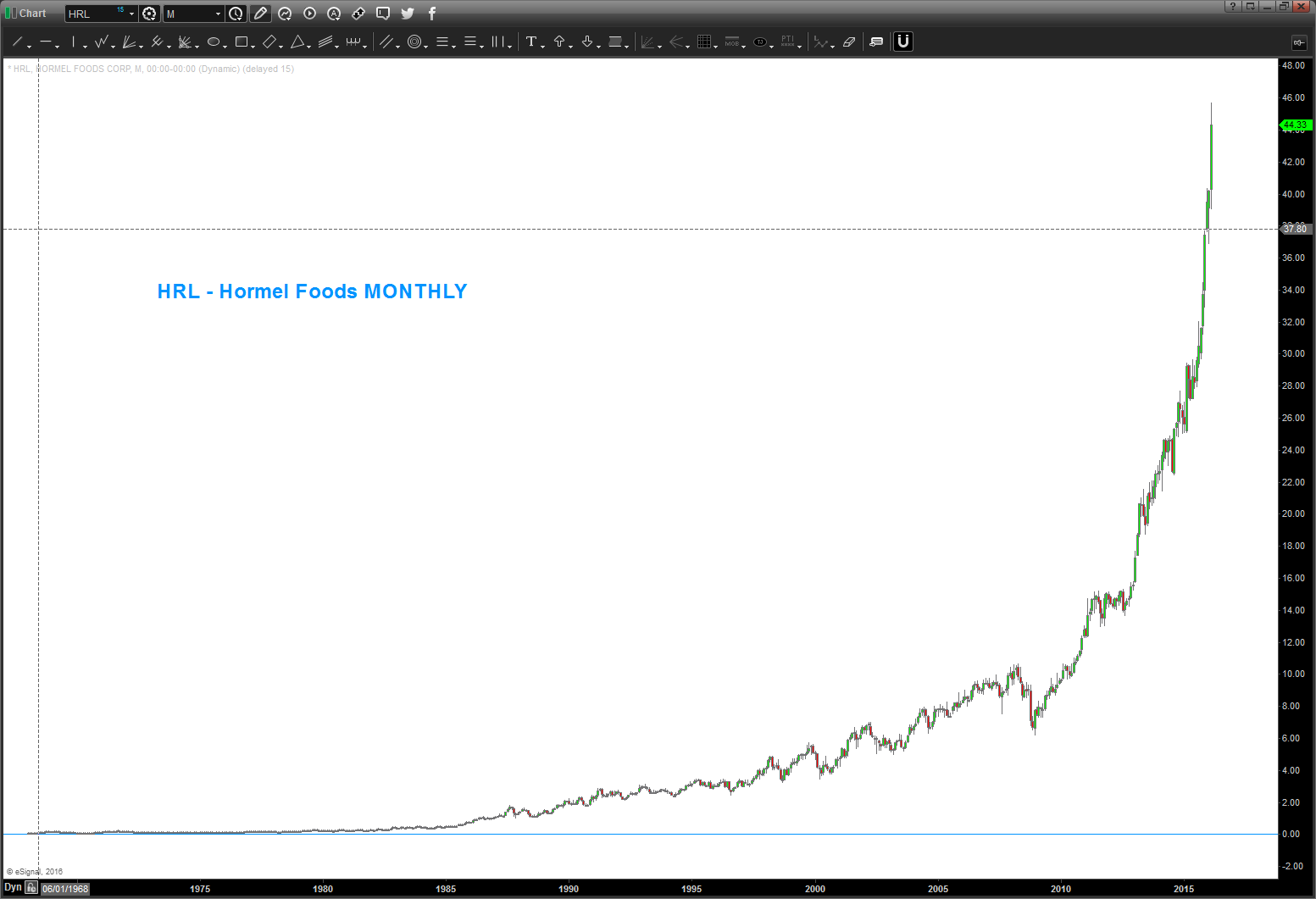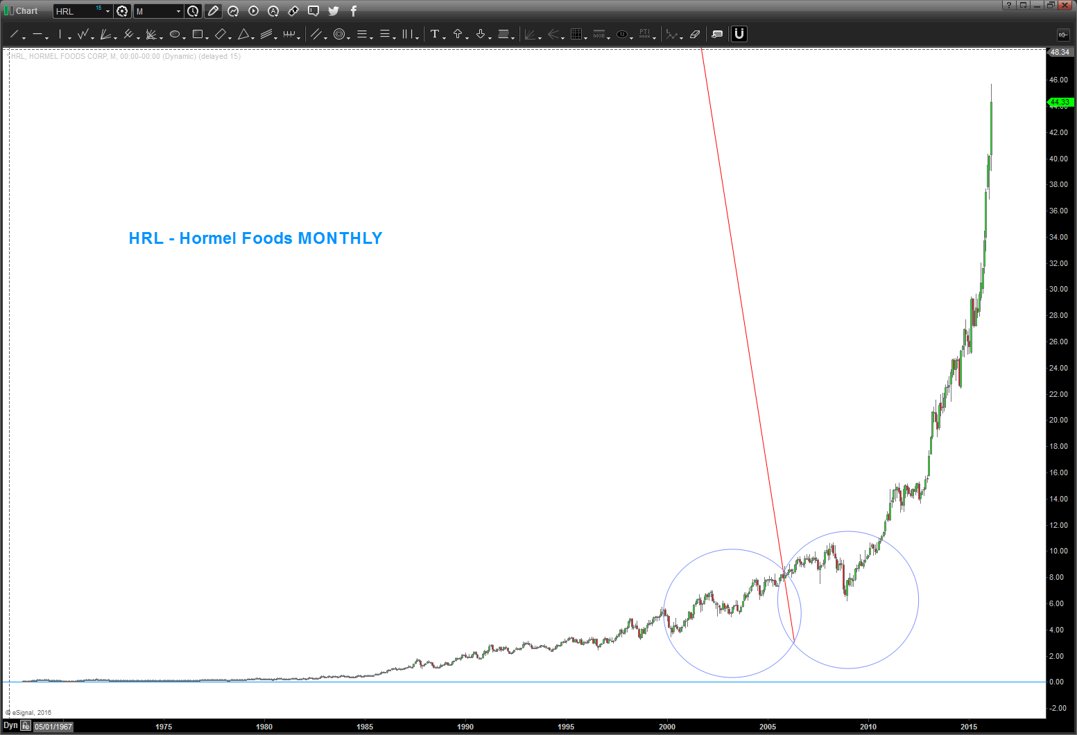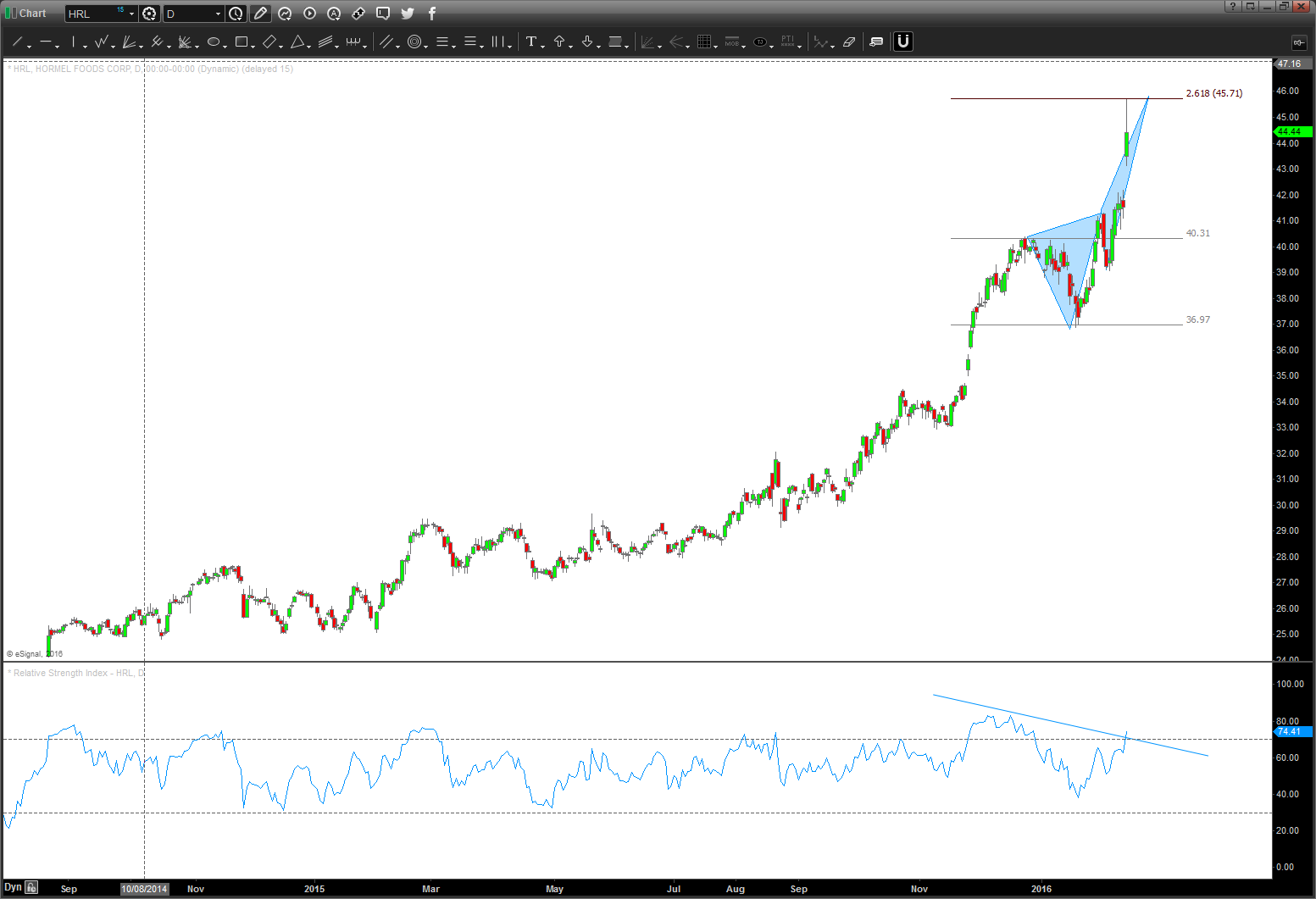 so take $HRL. Wow what a move … I mean amazing BUT folks it’s gone parabolic and today it has the beginning of an island reversal which is VERY BEARISH.