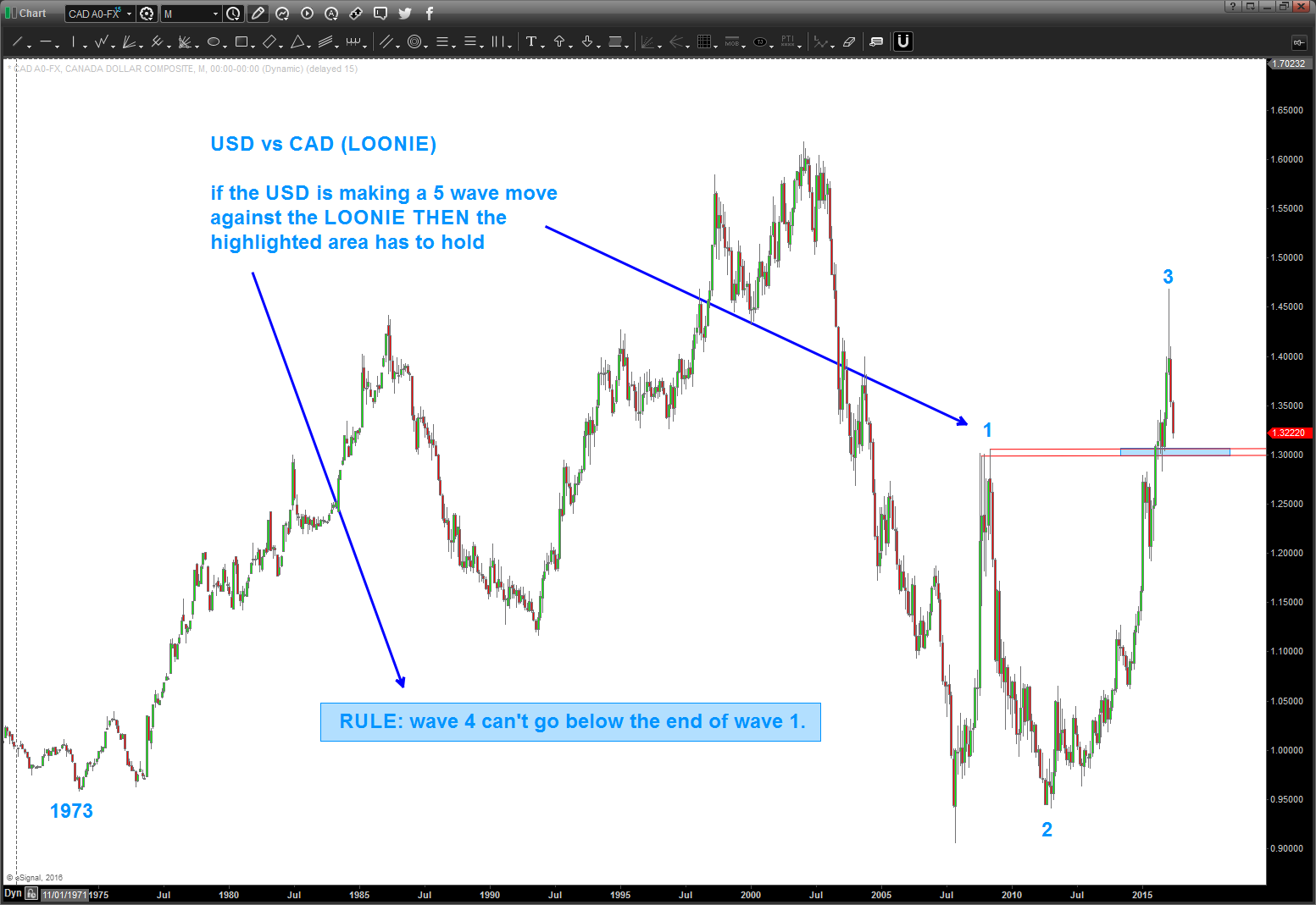 Here’s the deal – note the highlighted rule in the chart above. IF we are doing 5 waves in the USD vs LOONIE then the highlighted levels needs to hold. It’s that simple.