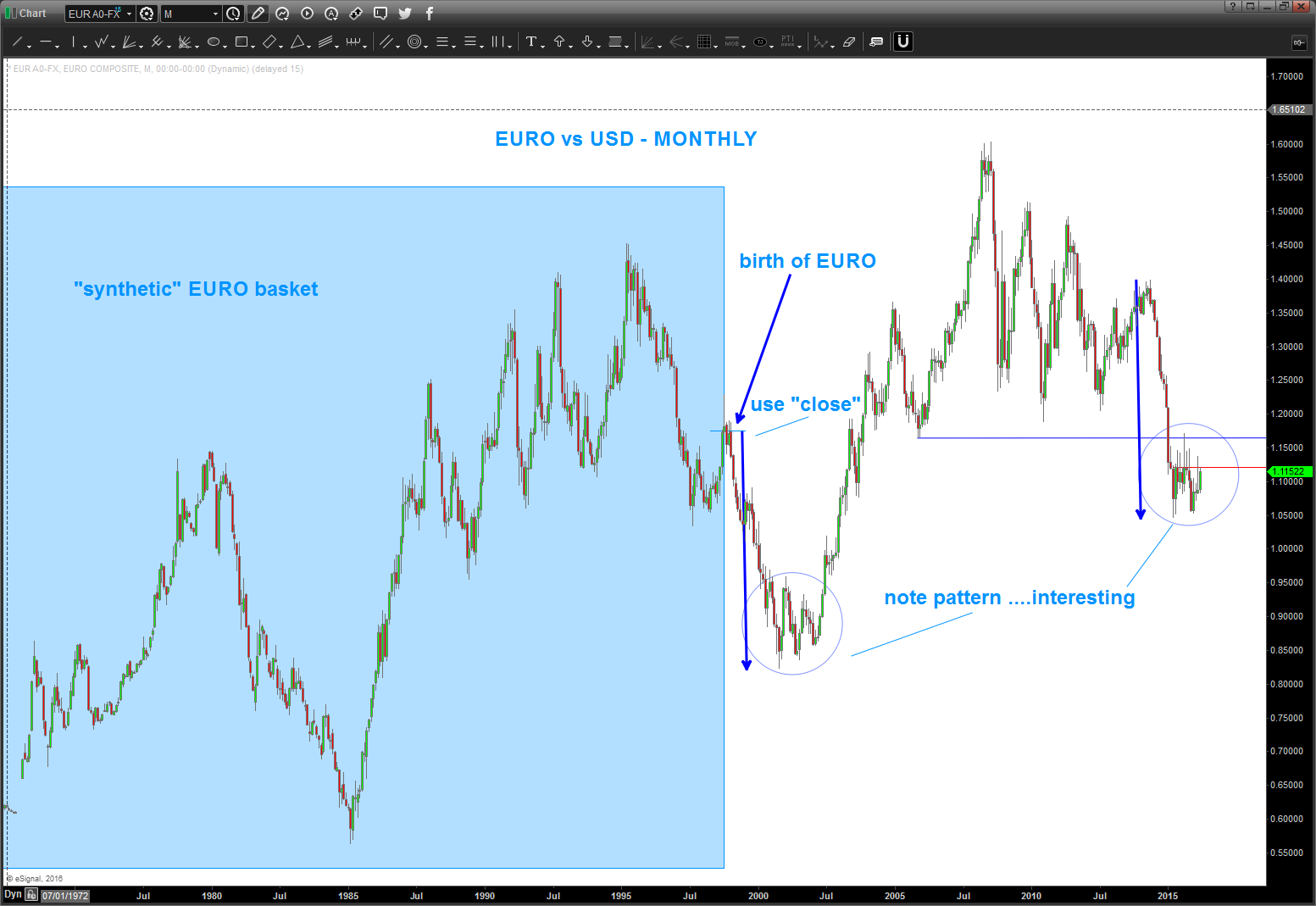 - note the move down into the low of 2000-2001. If we use the “close” during the birth month of the EURO then we have completed the same move – exactly.