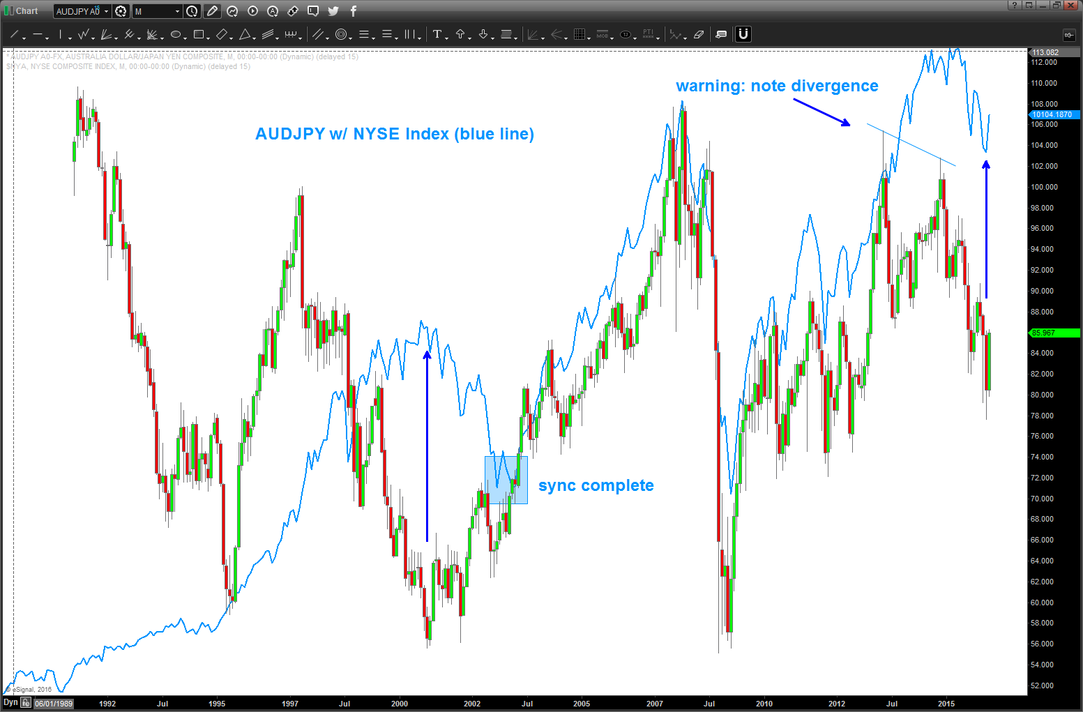 - as the NYSE was making new highs, the AUDJPY diverged (and completed the PERFECT PRICE pattern like 2007) and then the NYSE Index dropped …