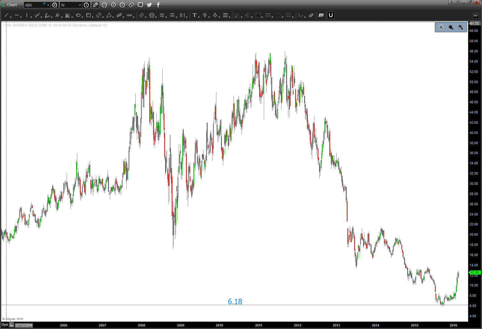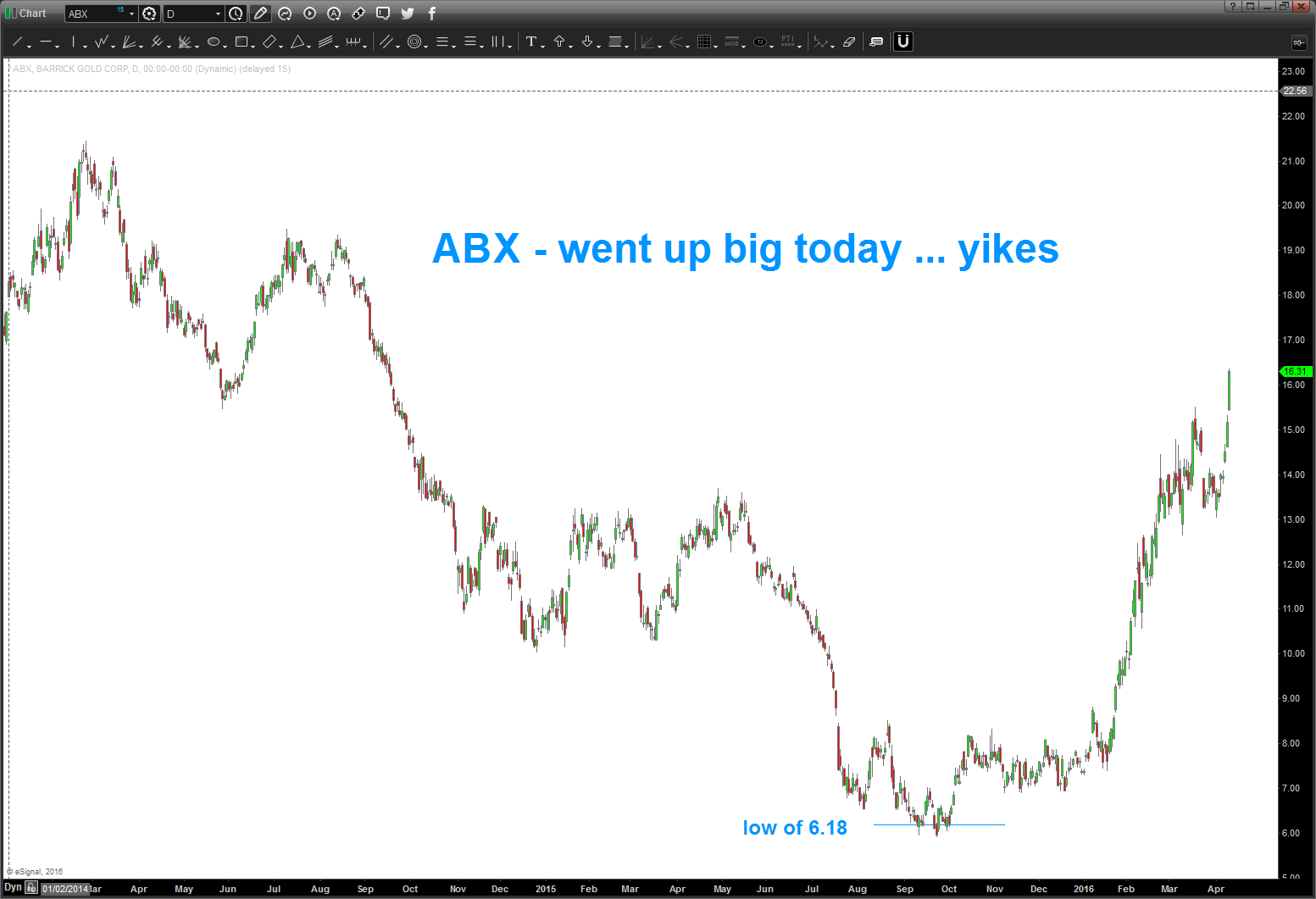 04/11/2016 update: ABX gap up today was impressive. this puppy is on a tear ever since it closed at the low of 6.18. HA … pretty cool.