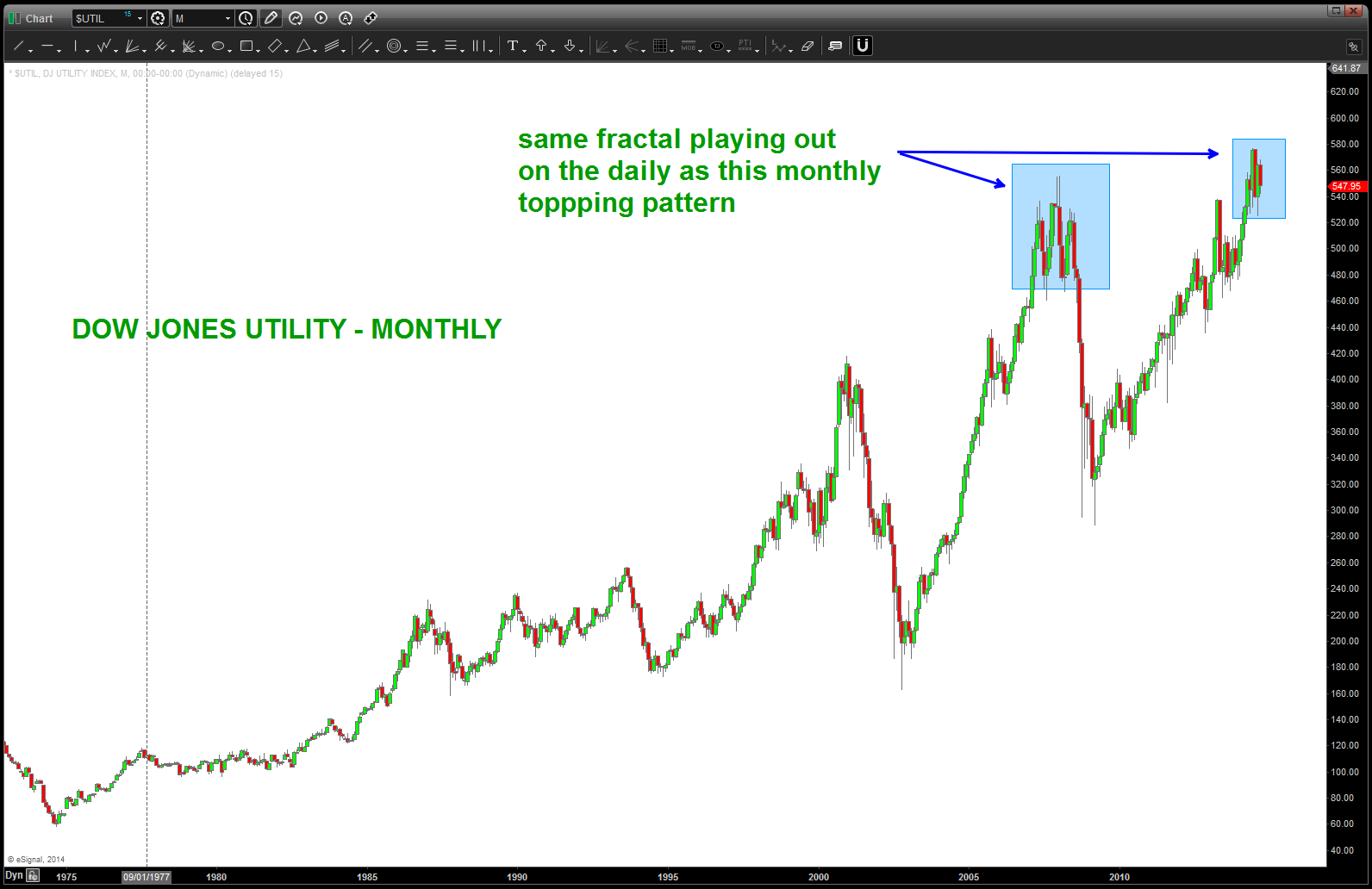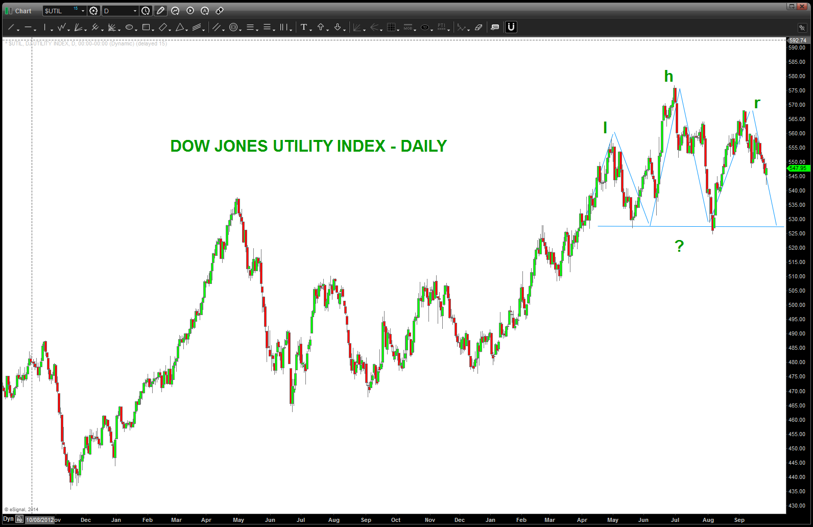 back in April 2014 (https://bartscharts.com/2014/04/19/dow-jones-utilities-long-term-1942-price-pattern/) we ID’d a long term pattern that was completing. the market subsequently went up into Jun/Jul and hit the target. now it appears we “might” be carving out a Head and Shoulders Daily topping pattern. Note, this same pattern came into play on a MONTHLY basis during the 2007-2008 time frame.